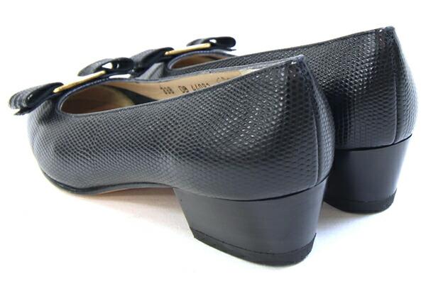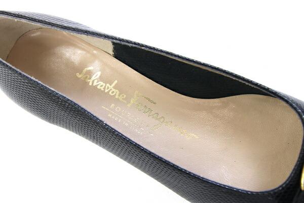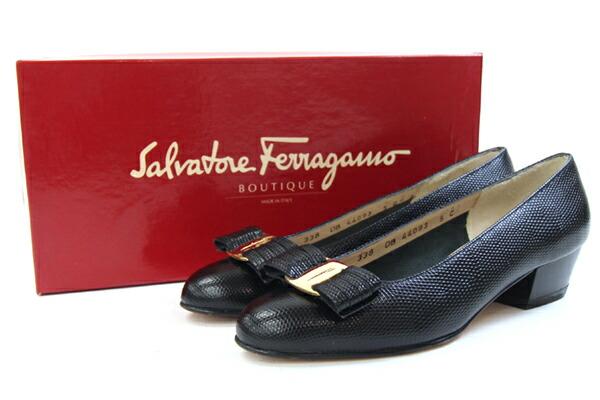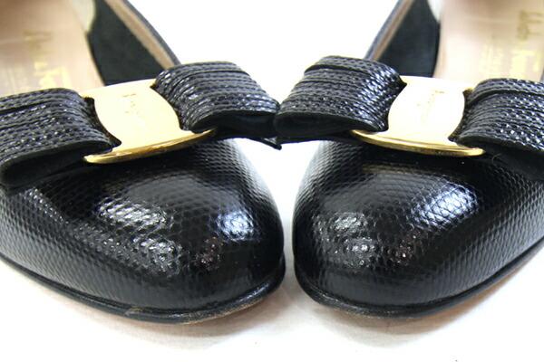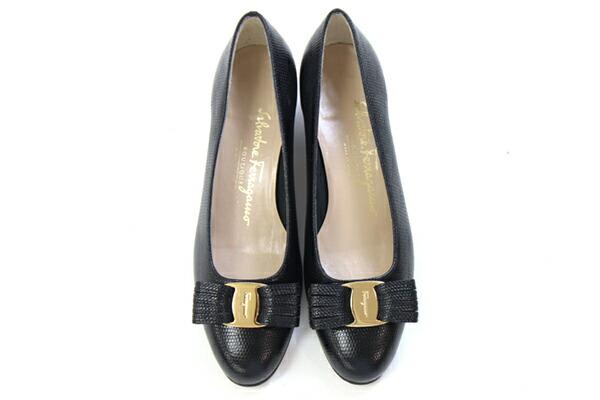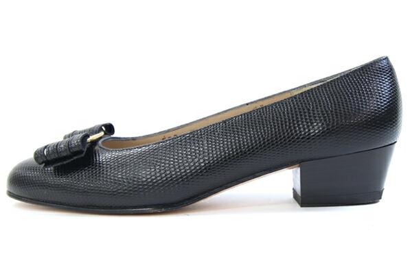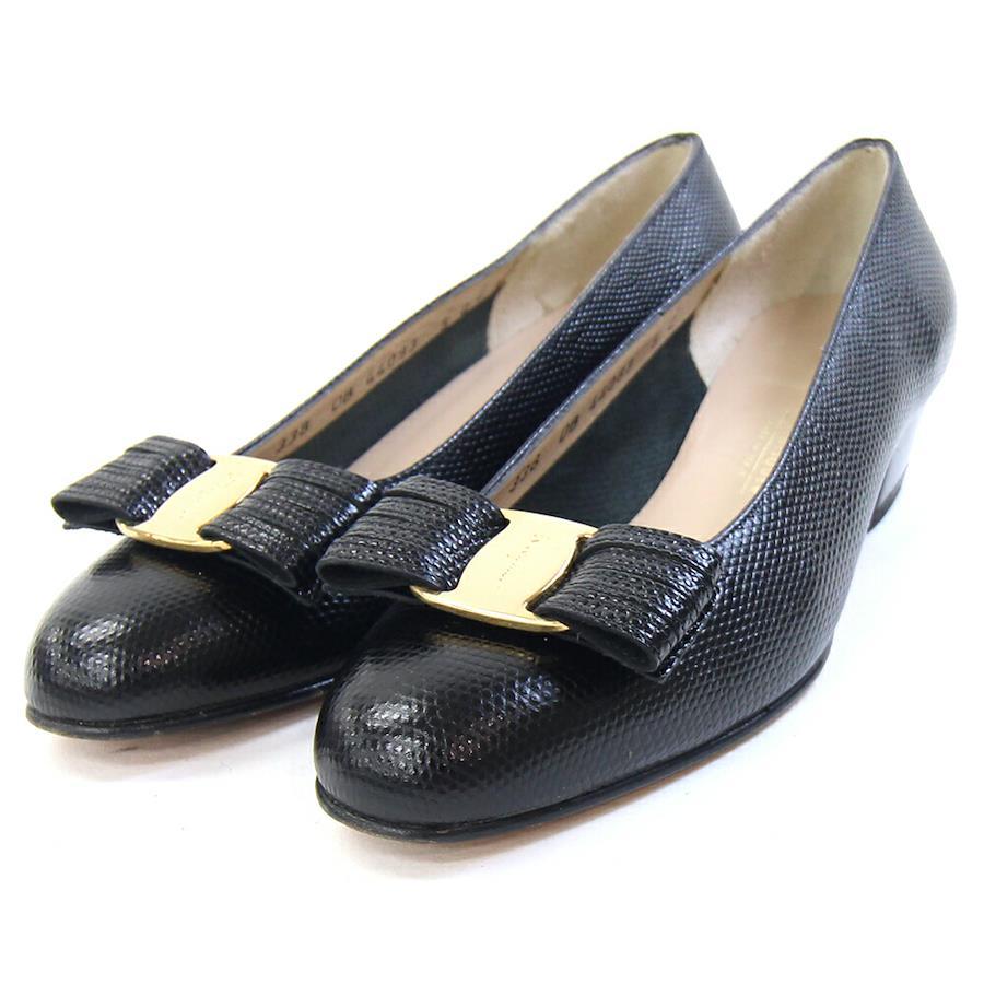 フェラガモレディースシューズヴァラパンプスブラックゴールド金具レザーサイズ5C中古リボン靴レディースSalvatoreFerragamo