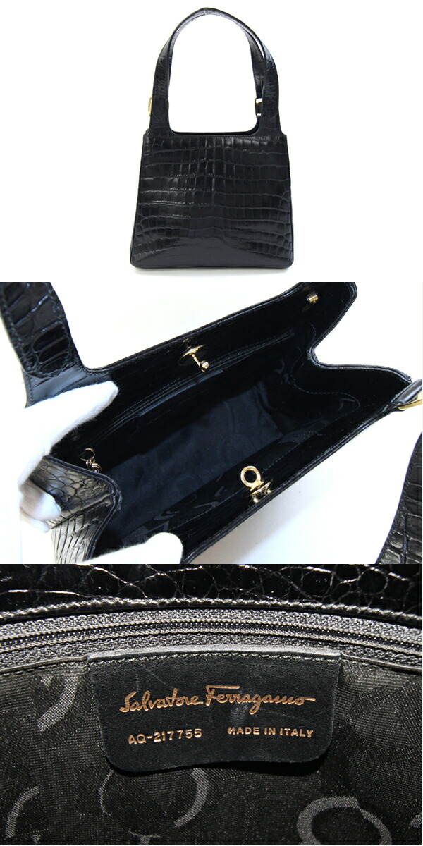 フェラガモ2WAYハンドバッグヴァラ217755クロコ型押しレザーブラック中古ショルダーバッグヴィンテージオールドレアクラシックミニSalvatoreFerragamo