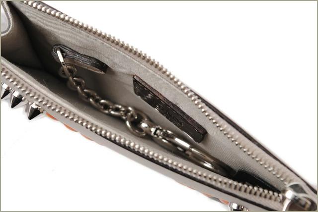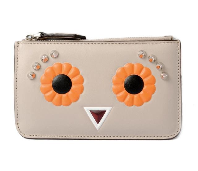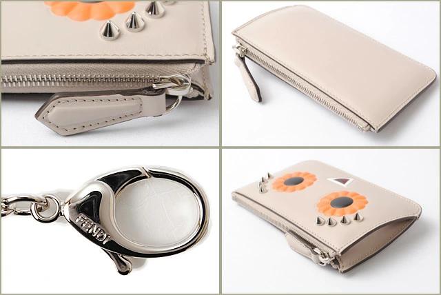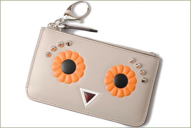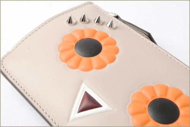 FENDI/フェンディより、コインケース/キーポーチです。パウダーグレーのカーフレザーを使用したミニポーチ。内側のスプリングクリップは収納が可能です。オレンジとブラックのレザーフラワーアップリケ、メタルスタッズ、ツートーンのプレキシガラススタッズでフェンディ フェイスのモチーフをデザインしています。コインケースと別々に持つ方にもおすすめ!キーケースや、ミニポーチにもなり、スマートなフォルムで、スーツの内ポケットやボトムスの後ろポケットにも、収納しやすいです。