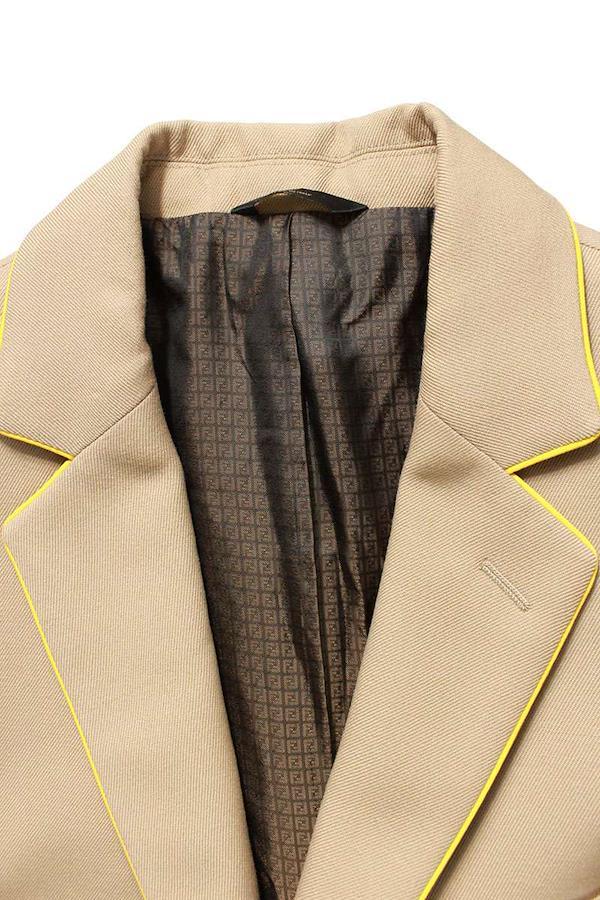ランク:A (使用感が少ない商品)状態備考:襟元に擦れがあります全体的に若干の毛羽立ちがありますブランド:フェンディサイズ:48色:ベージュ×イエロー実寸:肩幅45cm 身幅52cm 着丈74cm 袖丈64.5cm ウエスト幅42cm 股上26.5cm ワタリ幅32.5cm 股下75cm 裾幅18.5cm重さ:-素材:(表地) ウール97%、ポリエステル3% (JK裏地) キュプラ (PT裏地) レーヨン付属品:なしその他特徴:-管理番号:10728-251105-0240