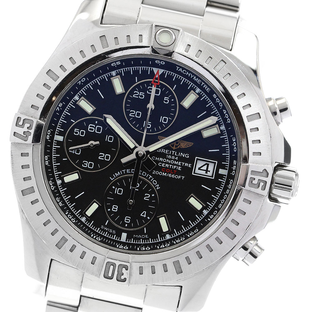■商品情報ブランド: ブライトリング/BREITLINGモデル名: コルト クロノグラフ 日本限定対象: メンズ素材: SS × SS文字盤色: ブラックムーブメント:自動巻きRef.No: A13388シリアル:**1/500機能・特徴:デイト,クロノグラフ,スモールセコンド付属品:余り駒 1コマ (約1.1cm)ケースサイズ(w):約 44mmベルトサイズ:約 19 + 1.1cm※ベルトサイズとは、ケース部分も含めた総腕回りのサイズになります。ラグ幅: 22mm日差: +8秒/日 ※参考値OH歴: 弊社では実施しておりません。