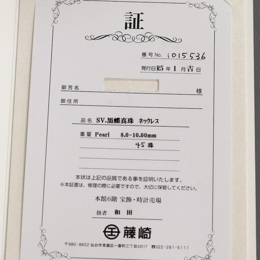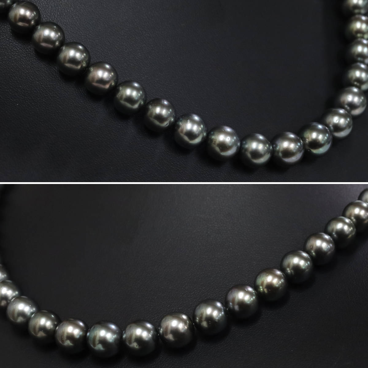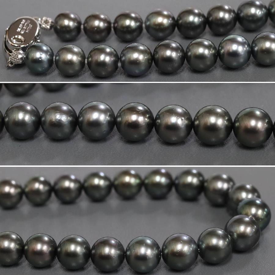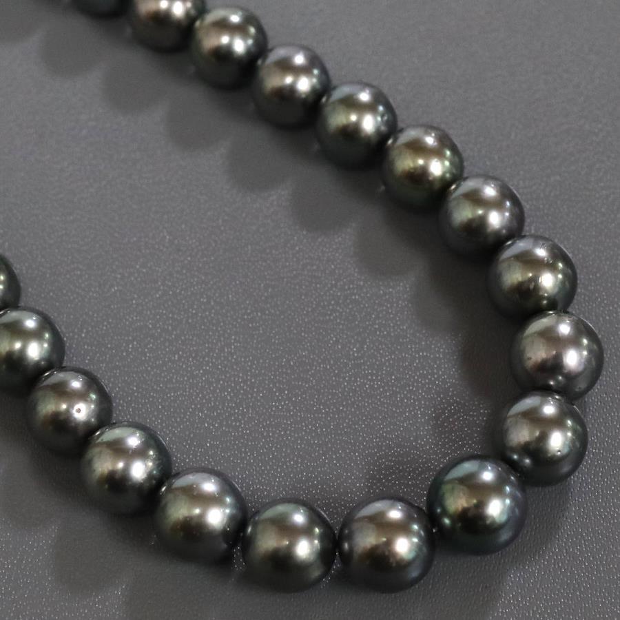 ブラックパールネックレスの中古品です。2023年1月に仙台藤崎で購入された保証書が付属します。パールはグレーやグリーンがかった色味に見えます。やや照りがあり、わずかにえくぼがありますが、そこまで目立ちません。地金にはわずかに小傷があります。+---+---+---+---+---+。{状態}AB{素材}トップブラックパール(黒蝶真珠)チェーンSILVER{サイズ}トップパール約8.0-10.0mm。チェーン長約41cm。{その他}50.8g。{付属品}内外箱,保証書{お問合せ商品番号}25090040+---+---+---+---+---+。