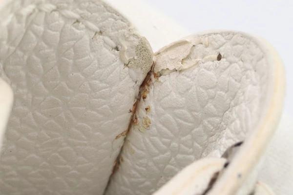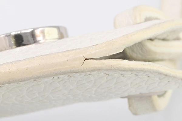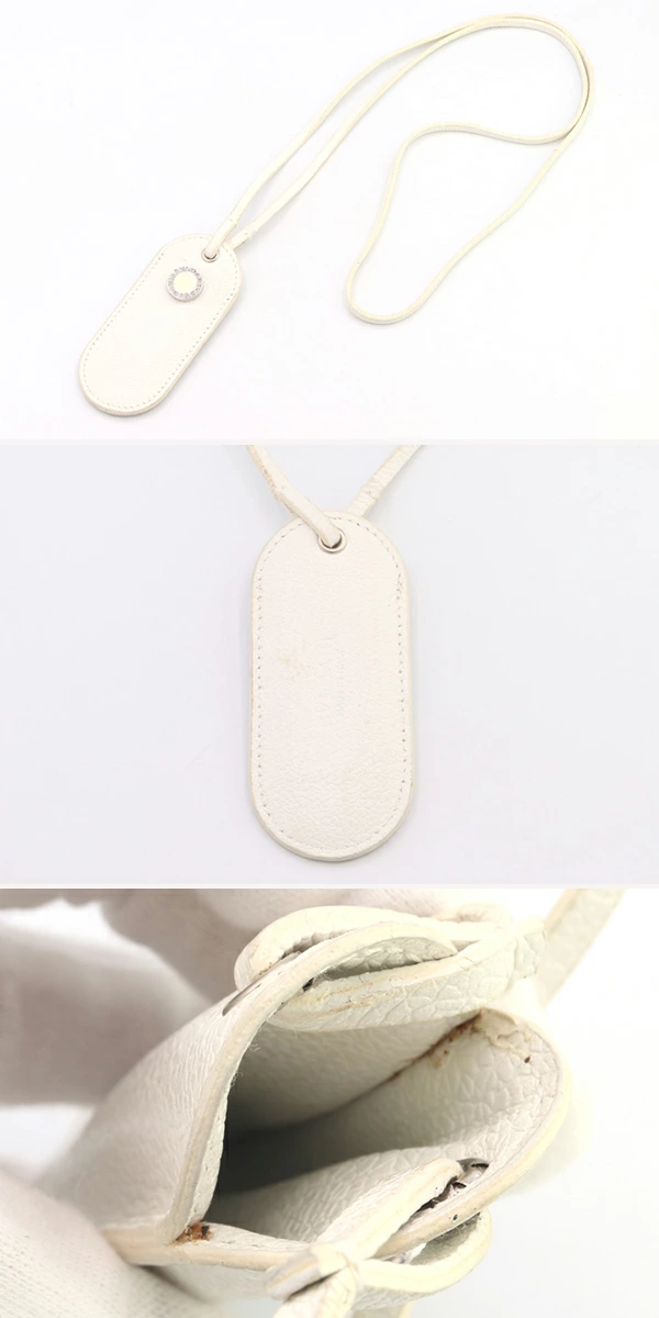 | 状態 | 外側:所々スレ・小汚れあり。ホルダーに使用跡の膨らみあり。ストラップフチ(コバ)に薄黄ばみ・ヒビ割れ多数あり。。 内側:薄汚れあり。フチにボンドヨゴレあり。 金具:微細なキズ、側面にクスミあり。 |