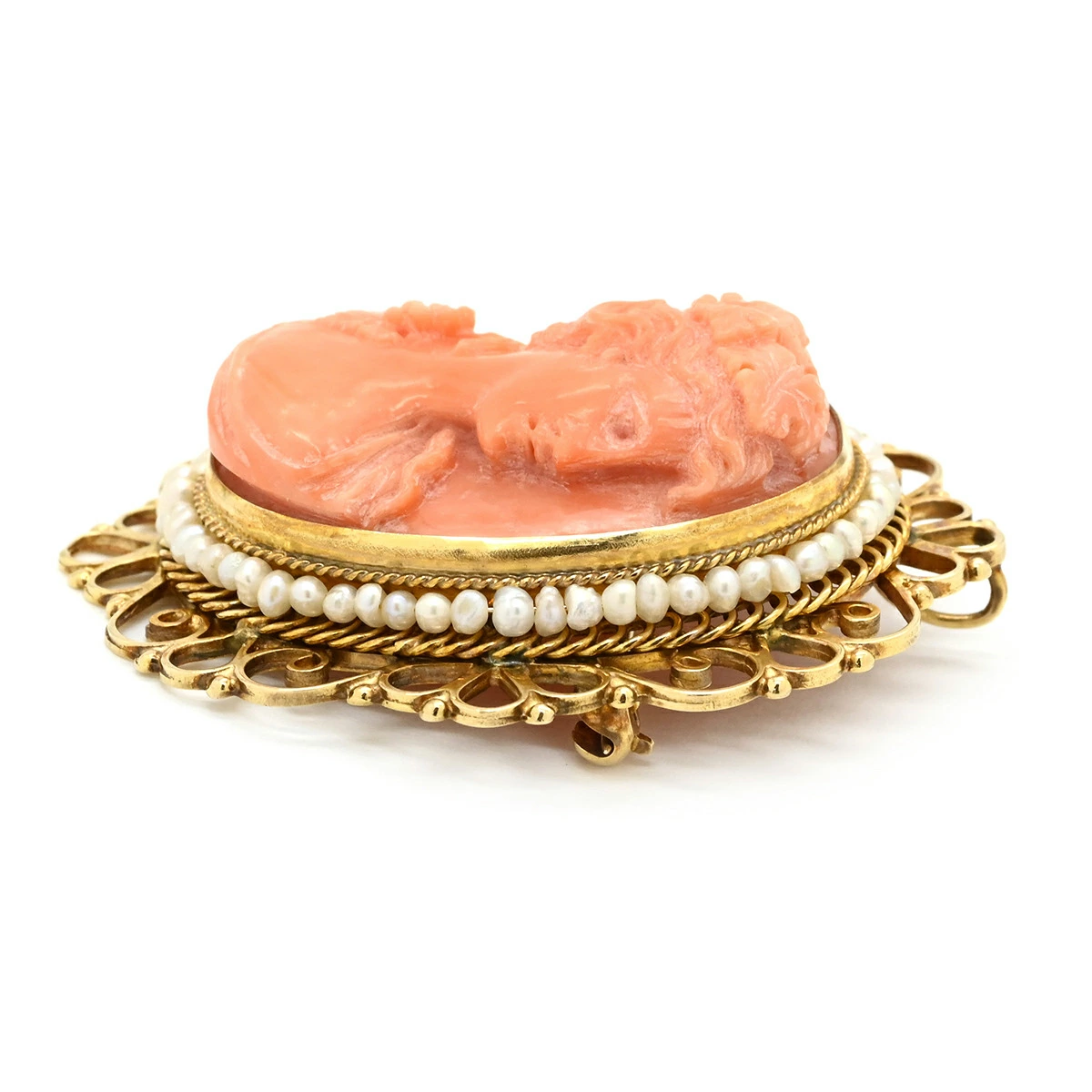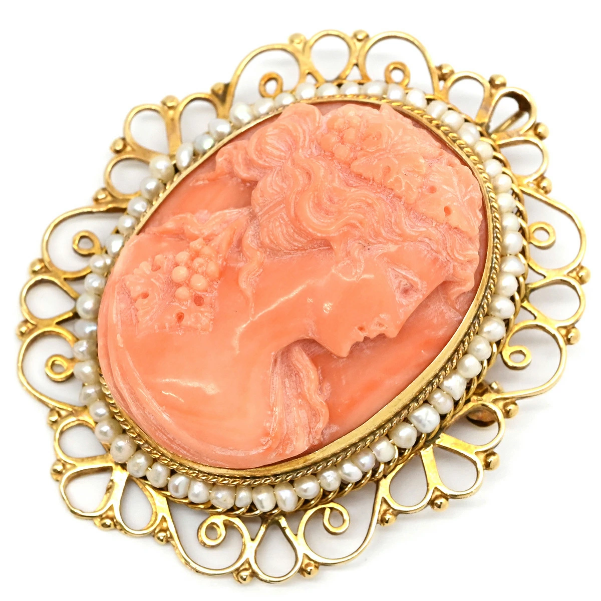 ノンブランド NON BRAND ブローチ カメオ K14YG 珊瑚(コーラル) イエローゴールド×パールホワイト 肖像 彫刻 小粒パール×珊瑚 ペンダントトップ - レディース定番 人気 美品 【中古】 管理コード240500510809 全体コンディション詳細: ご使用や保管により軽度のダメージがございますが、比較的状態の良いお品です。※画像、コメント欄参照 コンディション詳細:中古美品 金具に僅かな擦れやくすみ、珊瑚石に自然素材特有の色むらがございます。