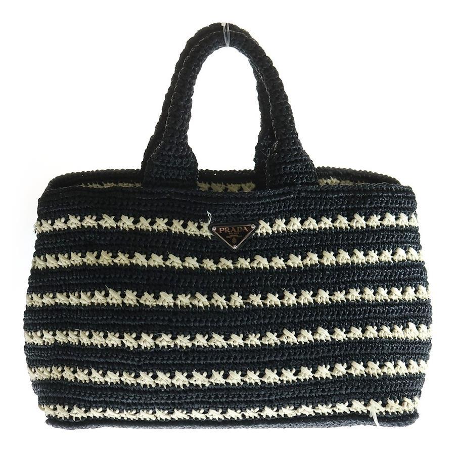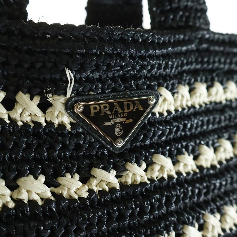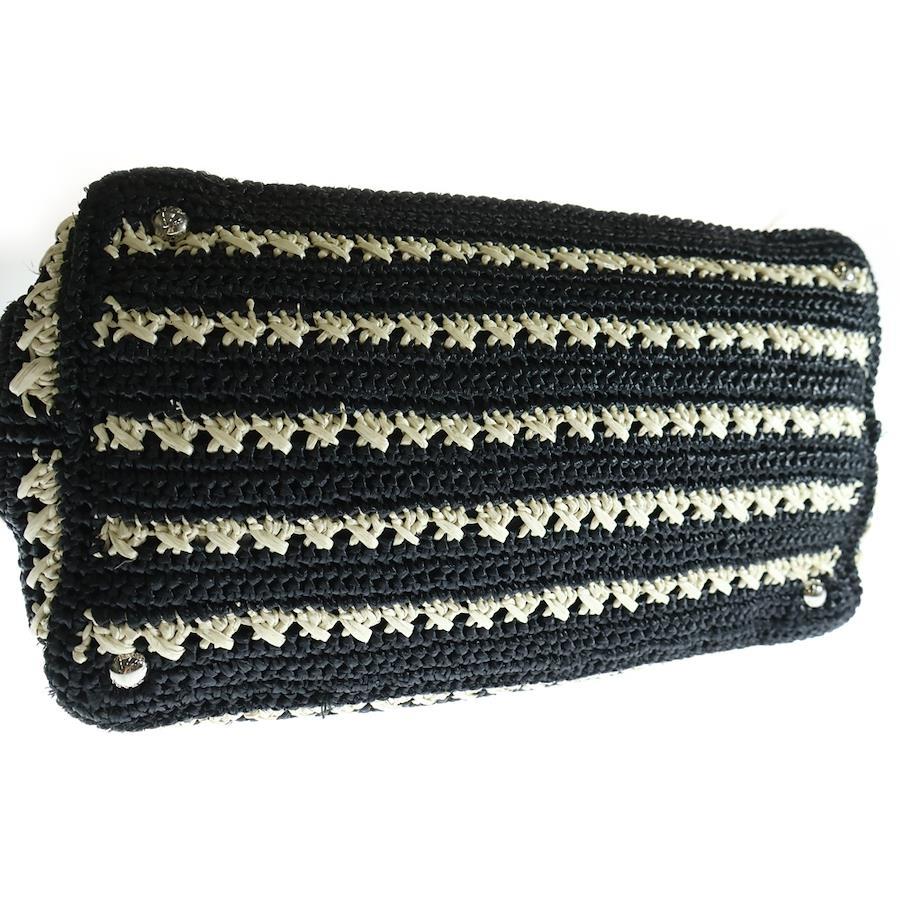 [モデル]カナパ ラフィア トライアングルロゴプレート カゴ ハンド トートバッグ シルバー金具 ブラック/ホワイト