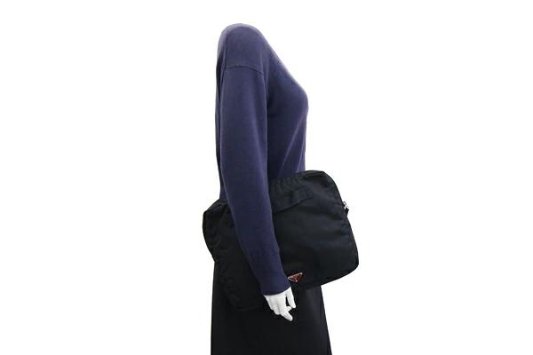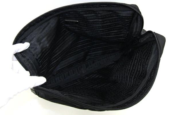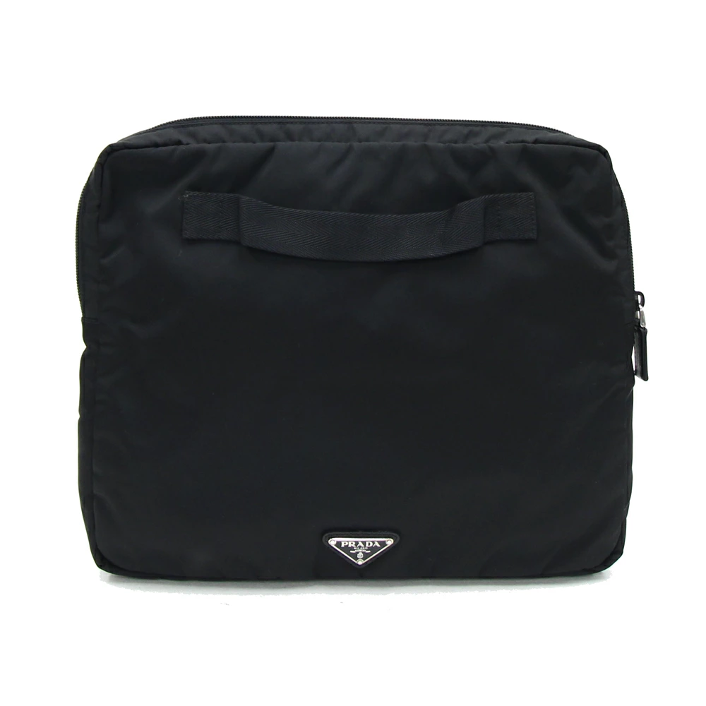 Used Prada clutch bag in black nylon and leather. Perfect for business, this computer bag features a logo and is perfect for men and women.