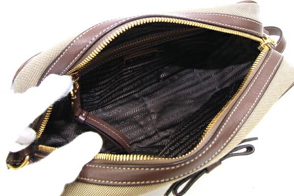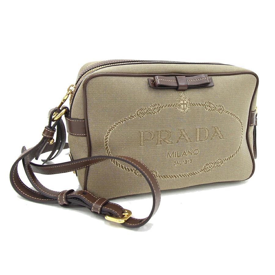 プラダショルダーバッグ1BH089ベージュブラウンジャガードキャンバスレザー中古斜め掛けポシェットロゴリボンレディースPRADA
