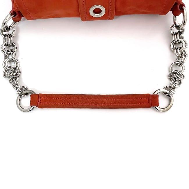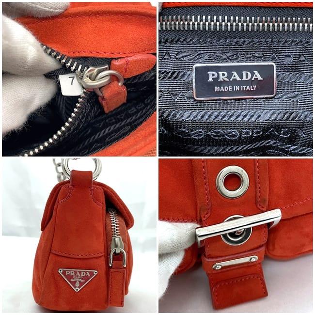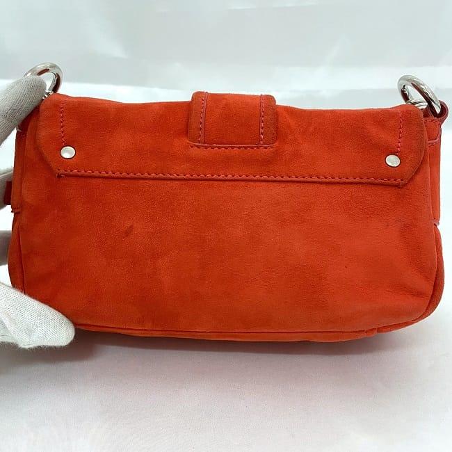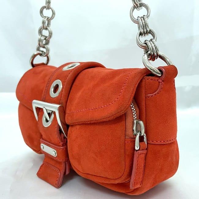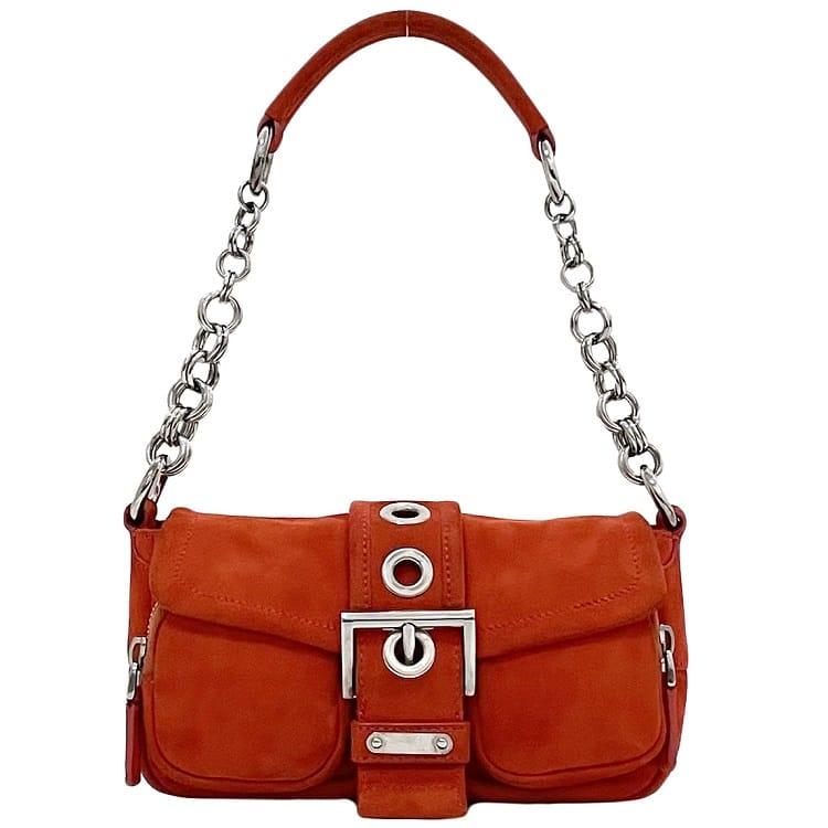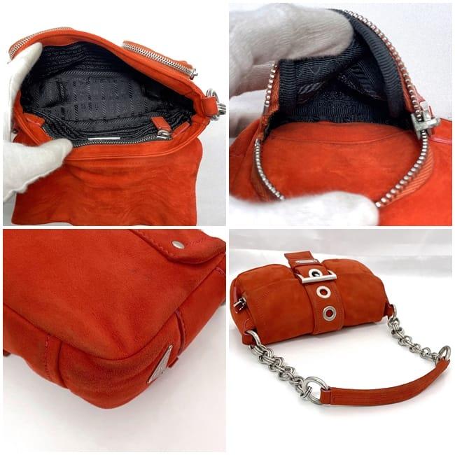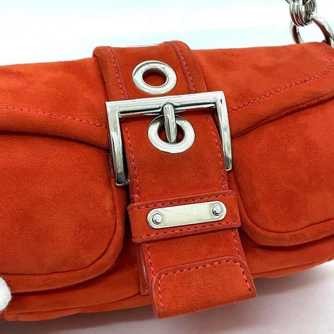 プラダ セミショルダーバッグ f-22732 オレンジ 美品 スエード レザー 中古 PRADA チェーン フラップ ヴィンテージ 三角 ロゴ プレート肩掛け ハンドバッグ フラップ トライアングルロゴ チェーンバッグ ベルト モチーフ 女性 男性 ブランド 本物 鑑定済み