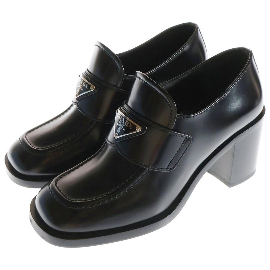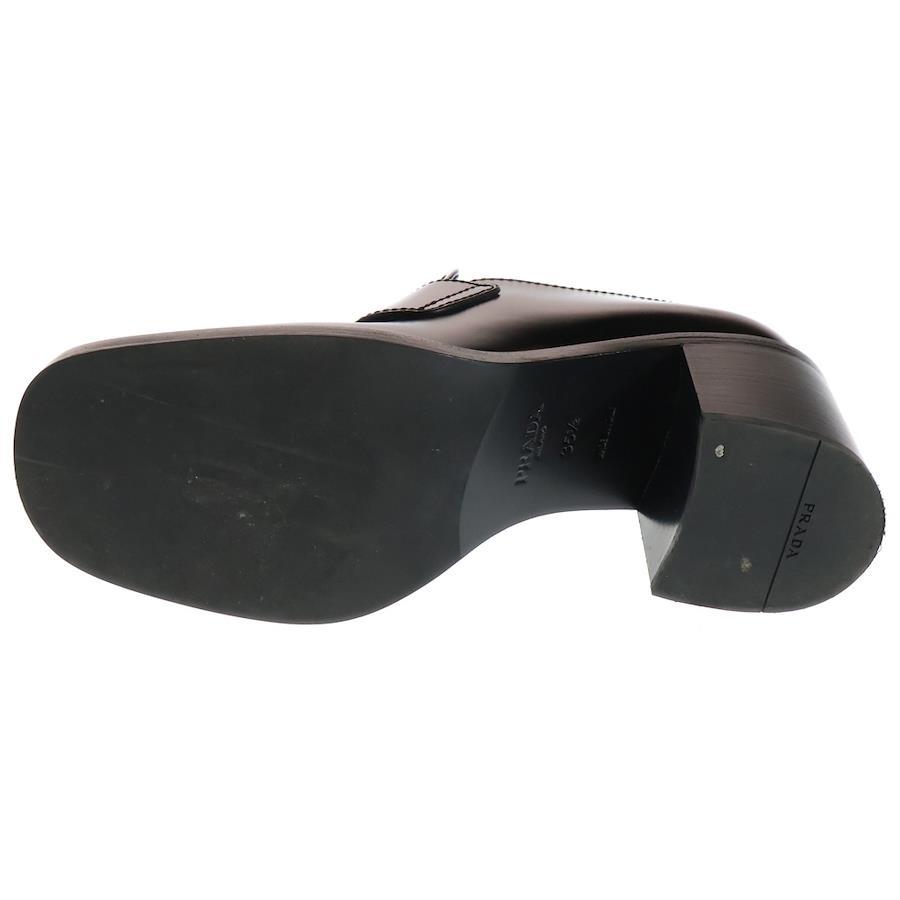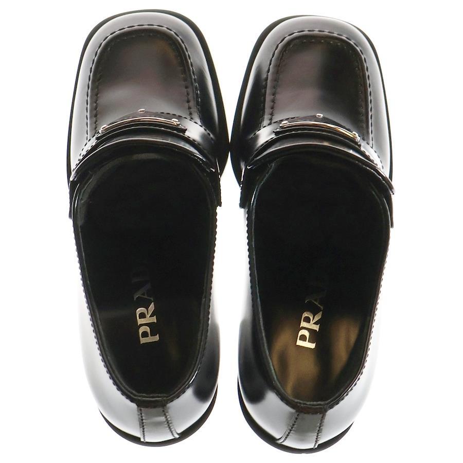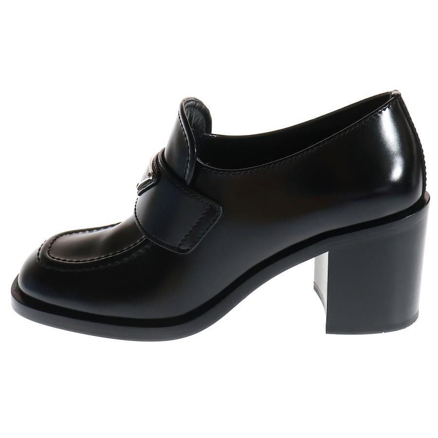 [モデル]トライアングルプレートロゴ チョコレート レザー ヒール ローファー ブラック ブラック 三角ロゴ