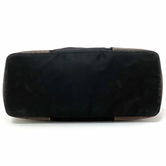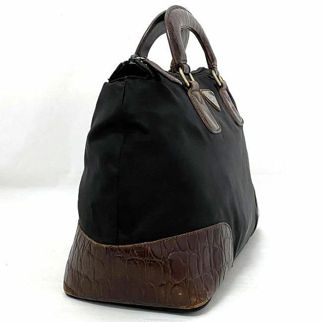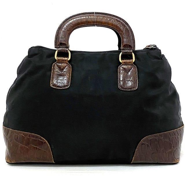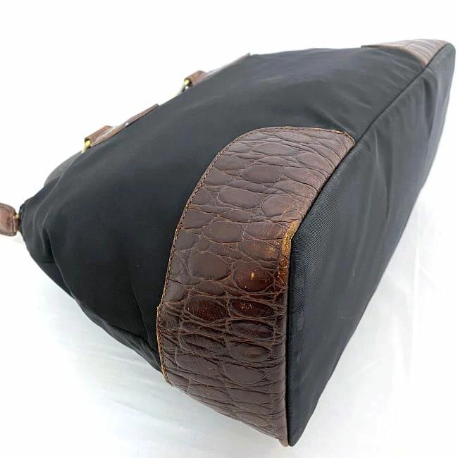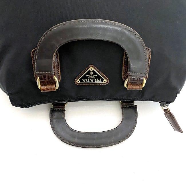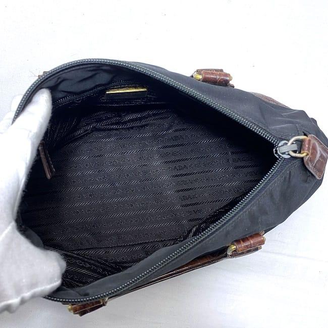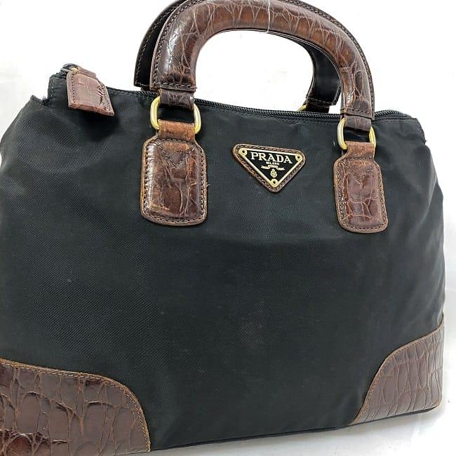 Prada handbag black brown test croc embossed nylon leather used PRADA triangle logo plate vintage rare fastener