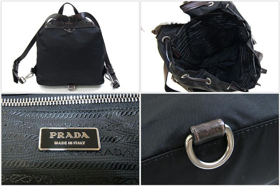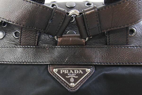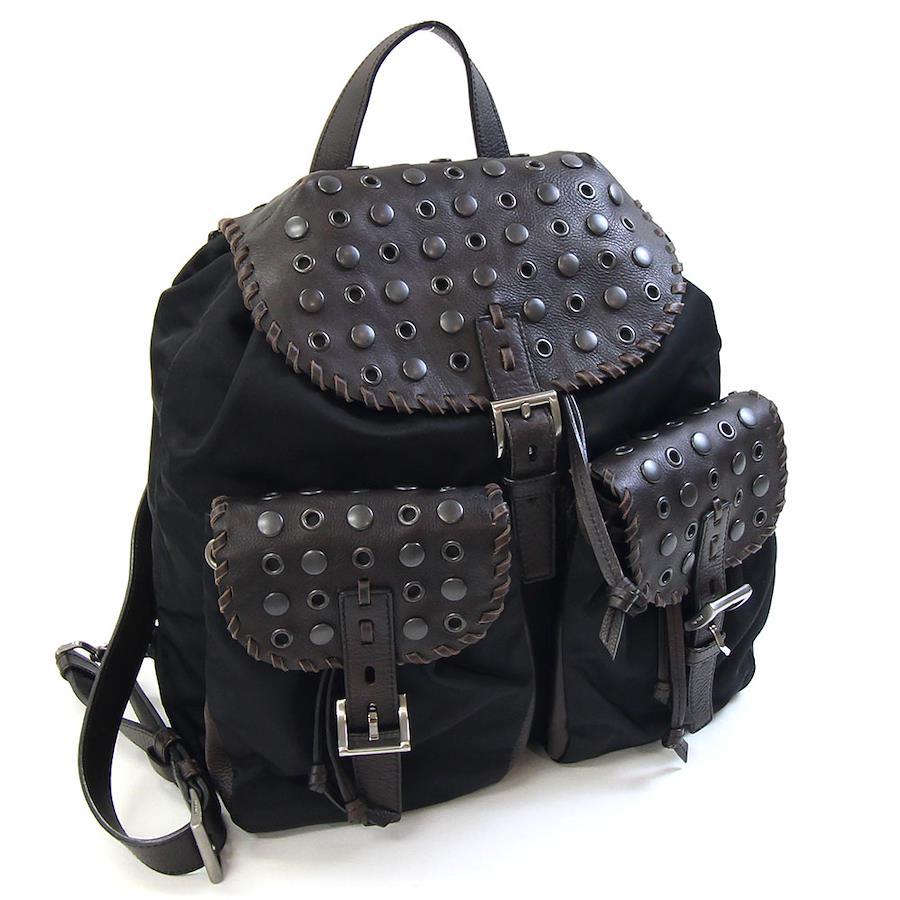 プラダバックパックブラックダークブラウンナイロンレザー中古リュックサックナップサックレディースかばんグルメットスタッズPRADA
