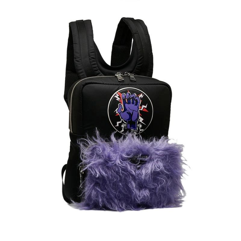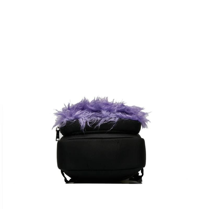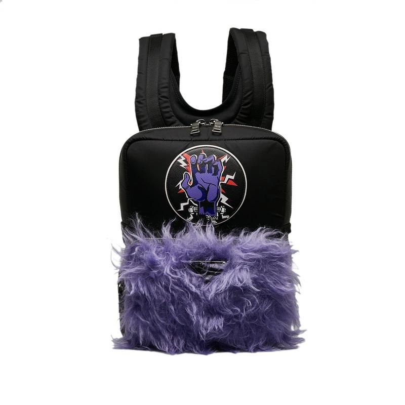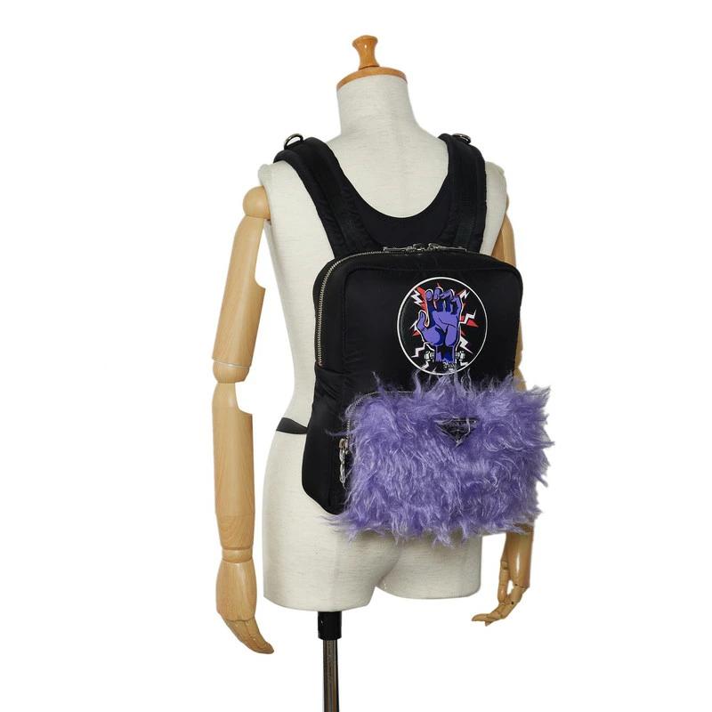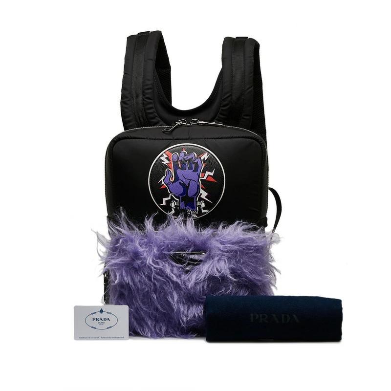 Pre-owned Prada Frankenstein Backpack 2VZ043 in Black and Purple Nylon with Fur, Women's