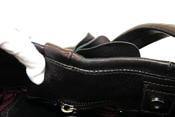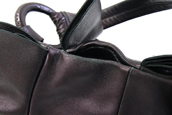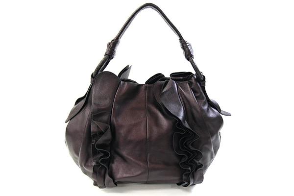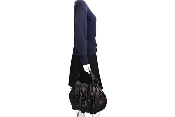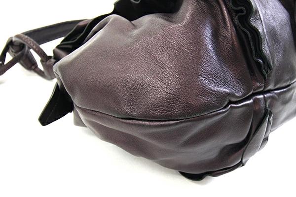 | 状態 | 外側:型崩れあり、フリルに乱れあり。所々小キズ、スレあり。底一部や入口周り等にスレによる色褪せあり。 内側:薄スレあり。レザー部分小キズ、スレあり。 金具:小キズ、スレ、クスミあり。 |
