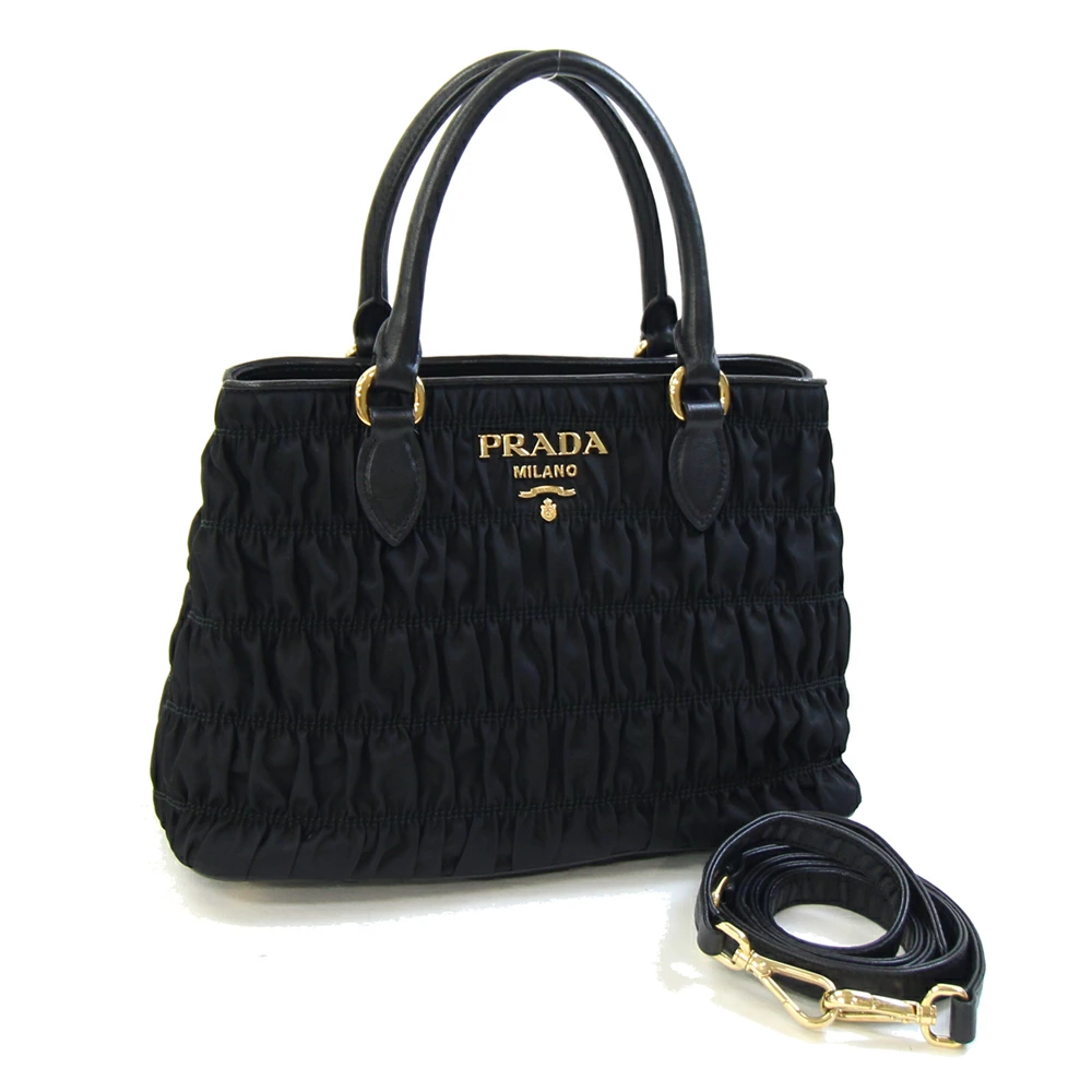 Pre-owned Prada 2-Way Handbag 1BA173 in Black Nylon and Leather. Can be worn as a shoulder bag or crossbody bag. Features gathered logo and pleats.