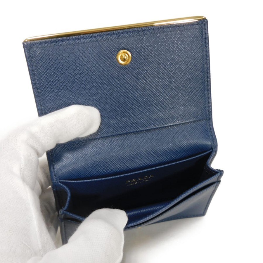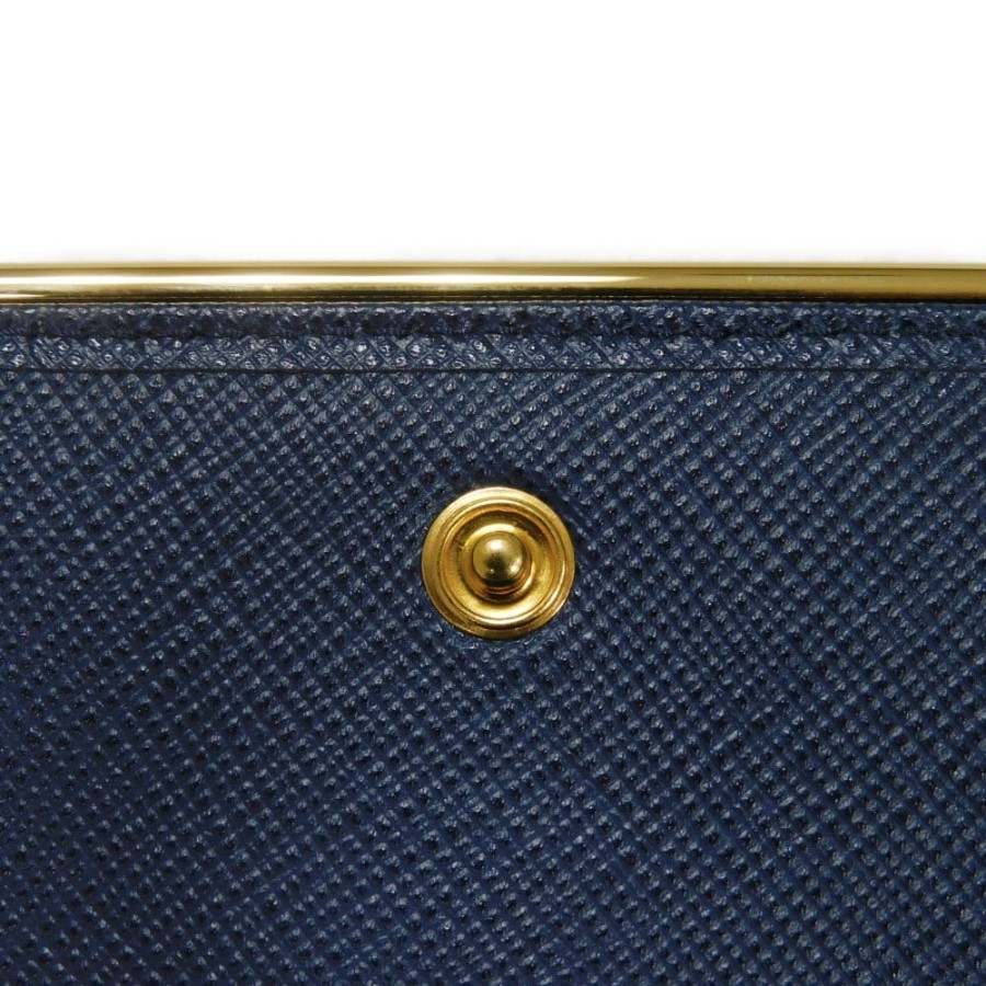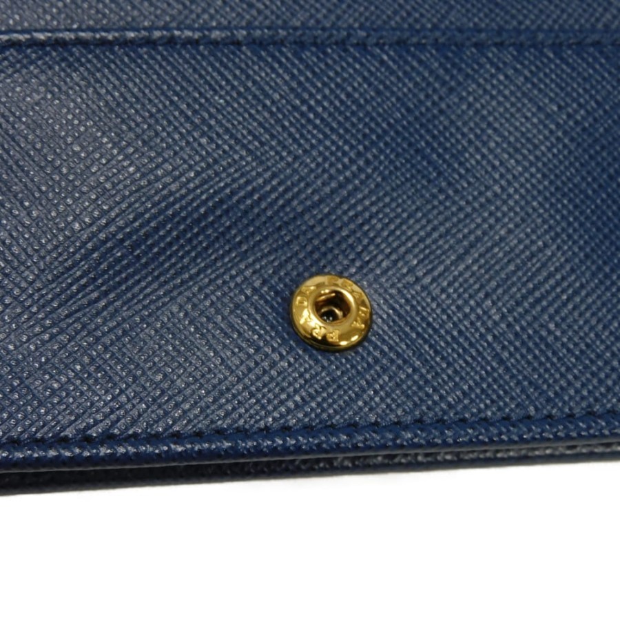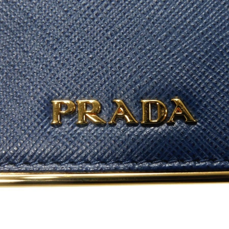 | 型押しカーフレザーにプラダのメタルロゴとプレートがあしらわれた「サフィアーノ メタル カードホルダー」スナップ式二つ折りカードケースです。 |