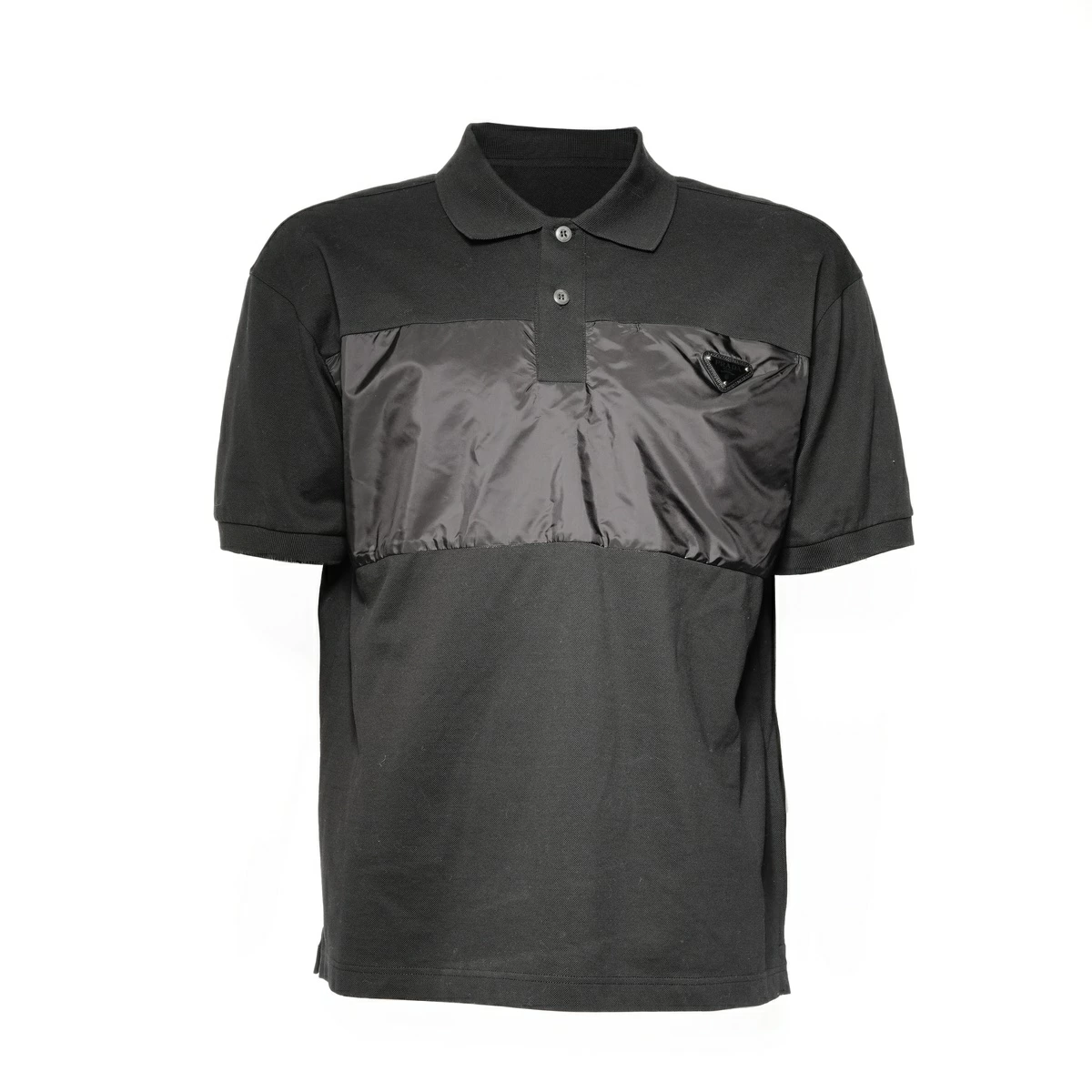 Pre-owned Prada nylon pique polo shirt, size L, with triangle logo and Re-Nylon, short sleeves, black, WS24611.