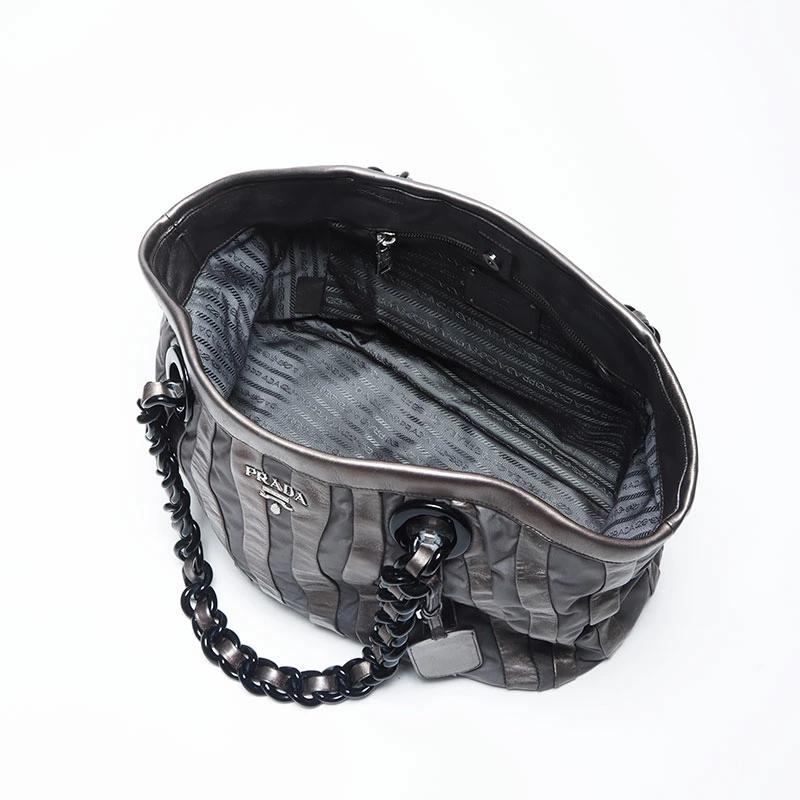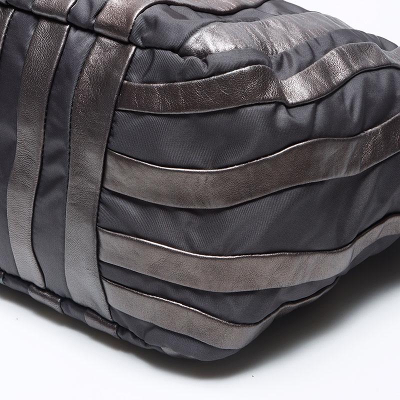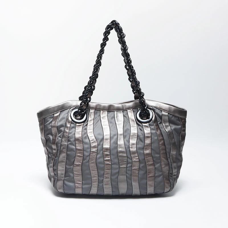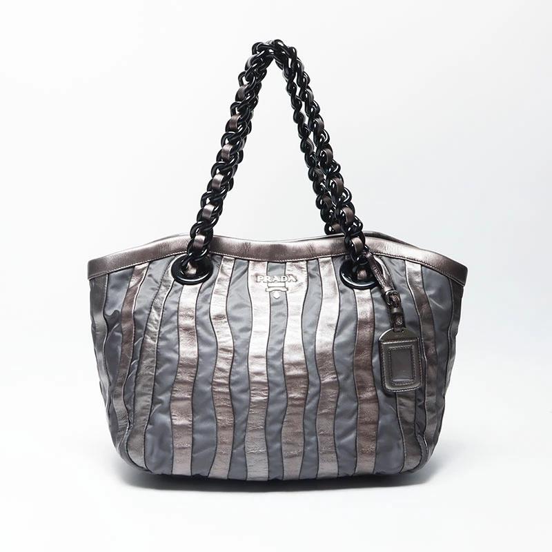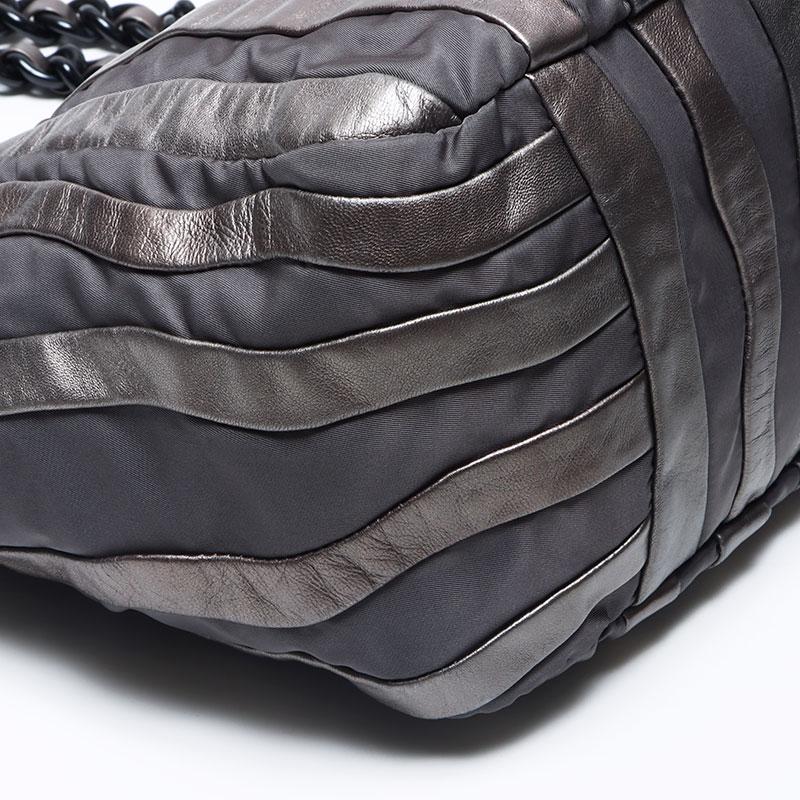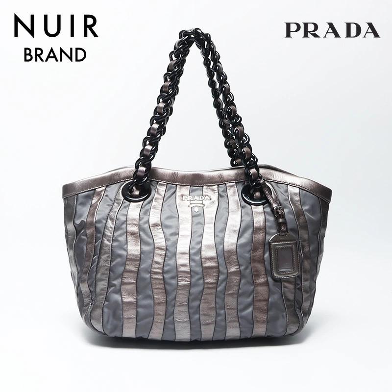 Pre-owned Prada nylon tote bag with leather chain and silver hardware, gray leather, WS4583.