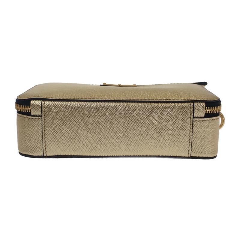 上質なレザーを贅沢に使用したミニマルでモダンなショルダーバッグ。洗練されたゴールドトーンのボディに、ブランドの象徴であるトライアングルロゴが煌めきを添えます。ブラックのストラップが全体を引き締め、エレガンスと実用性を兼ね備えた逸品。コンパクトながらもスマートフォンや小物を収納でき、都会的なスタイルを完成させます。