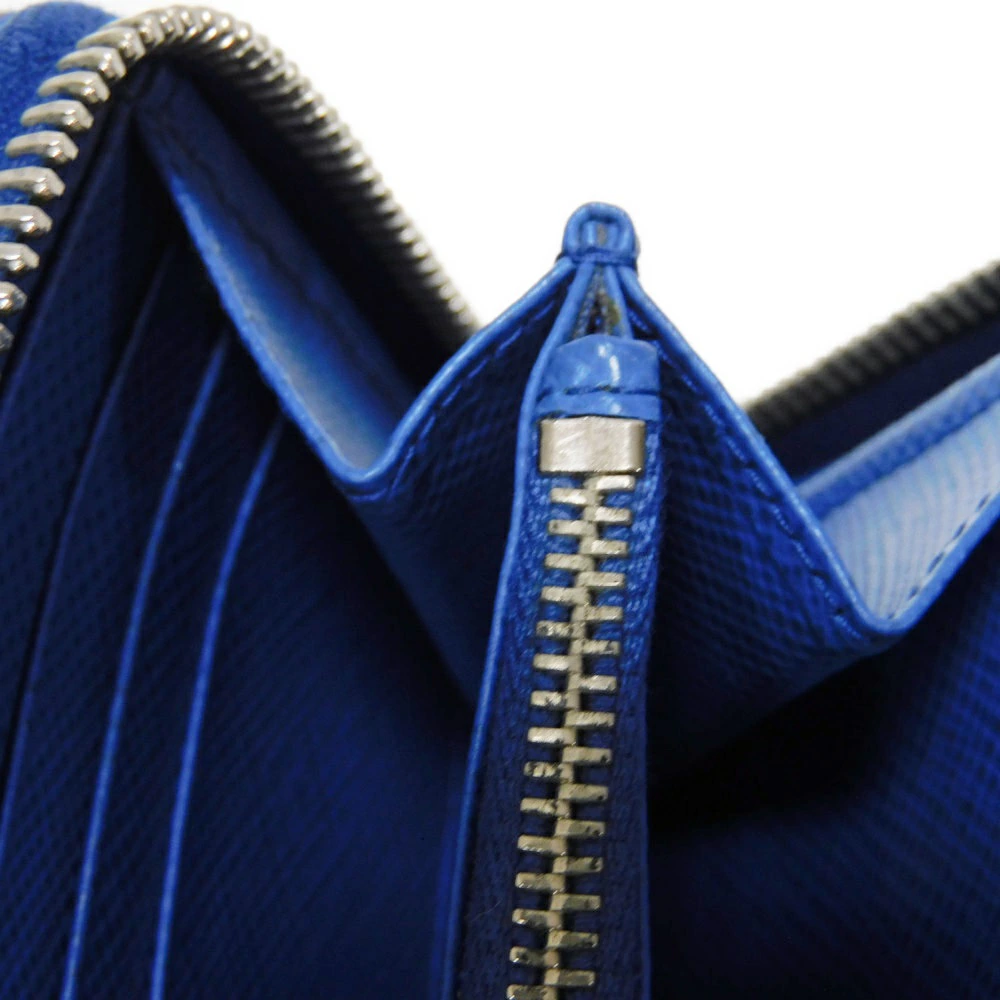 | 型押しカーフレザーにプラダのロゴがエンボス加工された「サフィアーノ ストライプ ジップアラウンド ウォレット」ラウンドファスナー式長財布です。 |