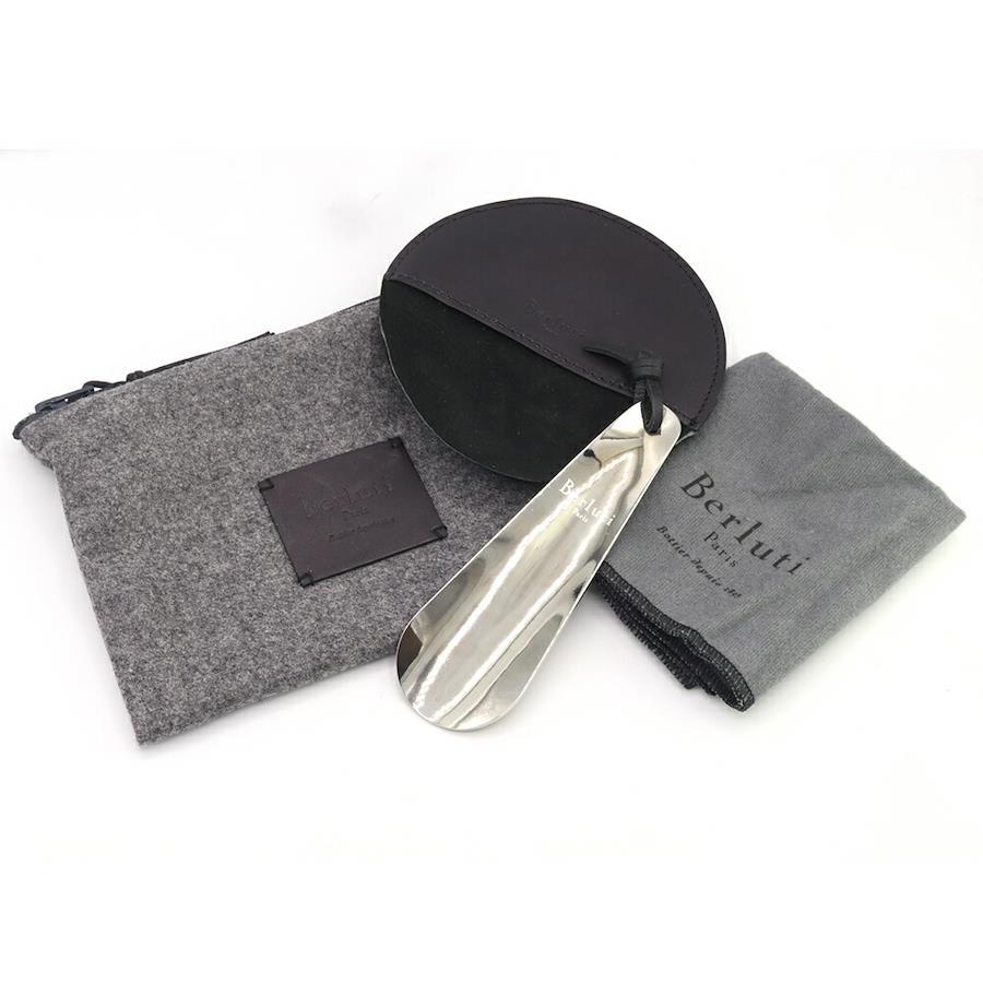 Pre-owned Berluti 3-piece shoe care set in stainless steel with pouch, shoe horn, shoehorn, leather care set, and shoe polish.