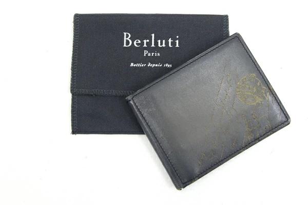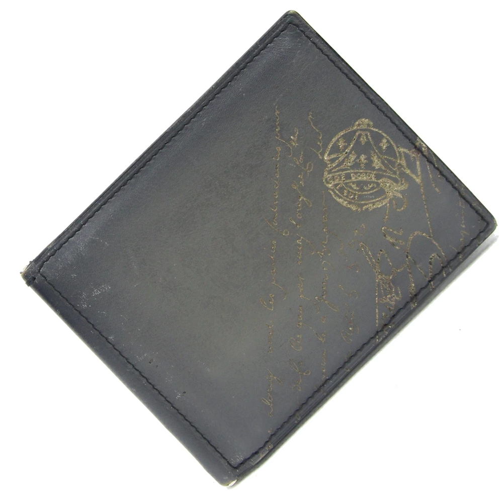 Berluti Bifold Money Clip, Calligraphy Figure, Gray Leather, Pre-owned, Compact Wallet, No Coin Purse, Men's