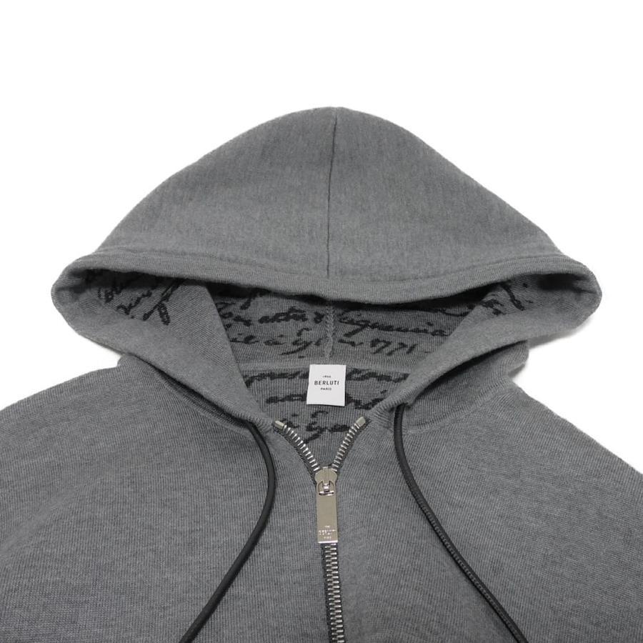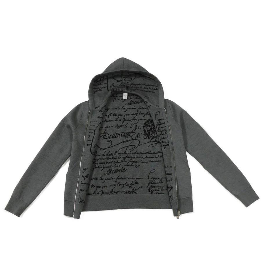 | ウール素材のライニングにベルルッティのカリグラフィパターンがデザインされた「ダブルフェイス スクリット ジップ フーディ」パーカーです。 |