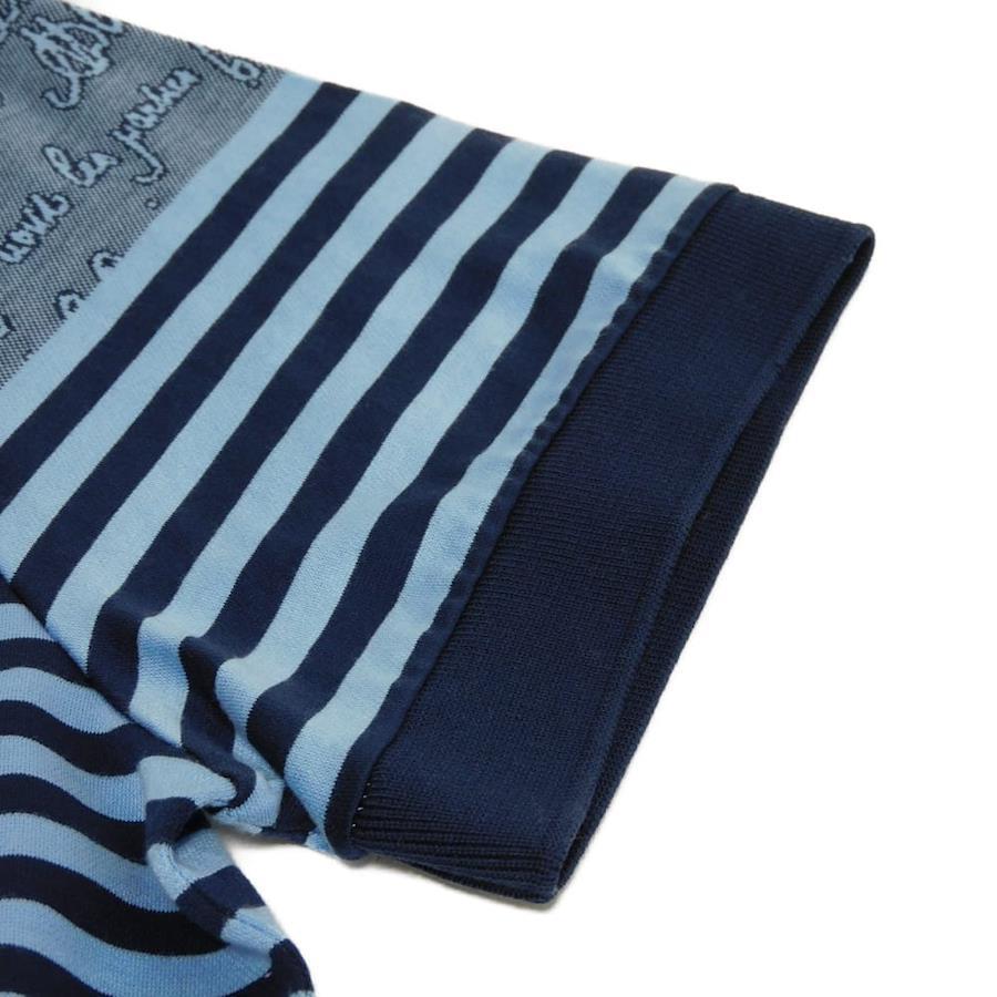 | コットン素材にカリグラフィのデザインとストライプ柄を組み合わせた「スクリット ポロシャツ」ハーフボタンの半袖シャツです。 |