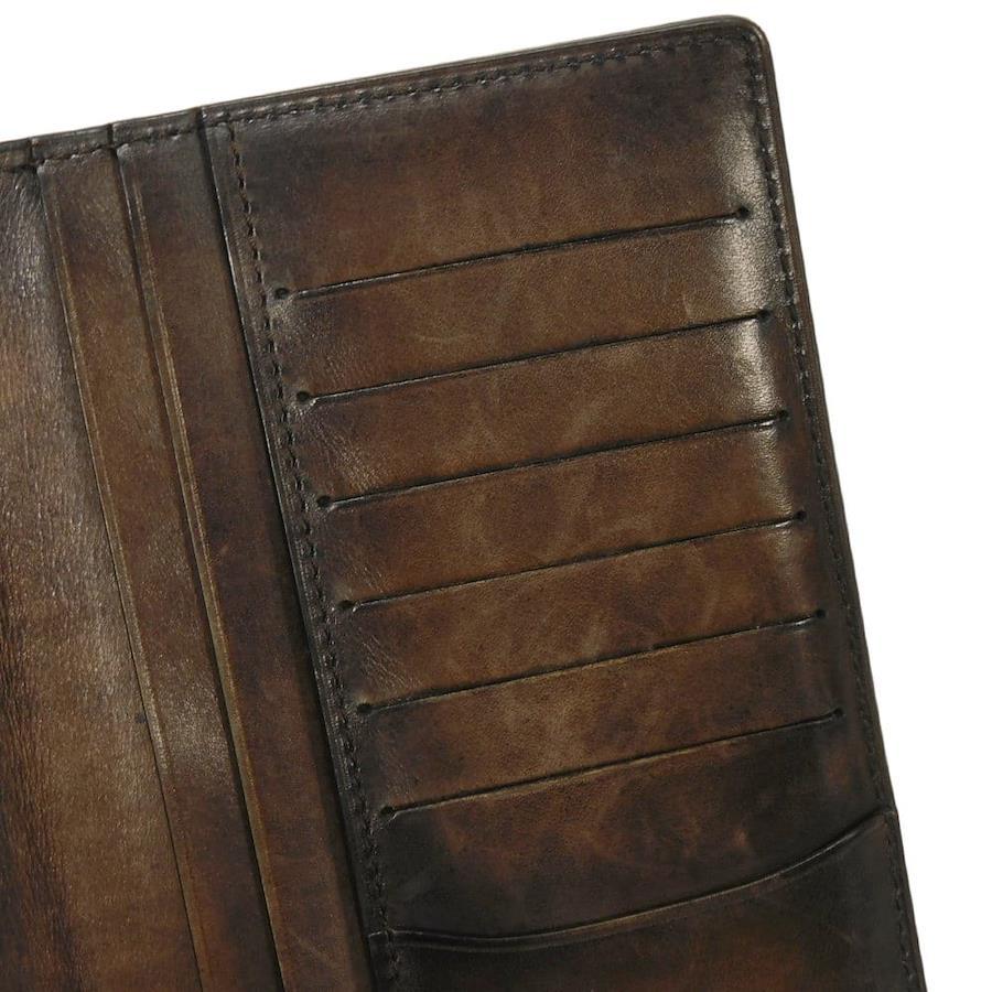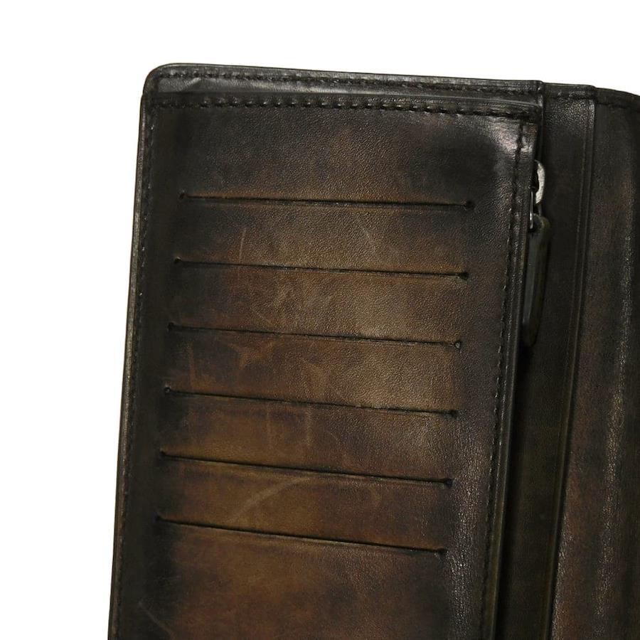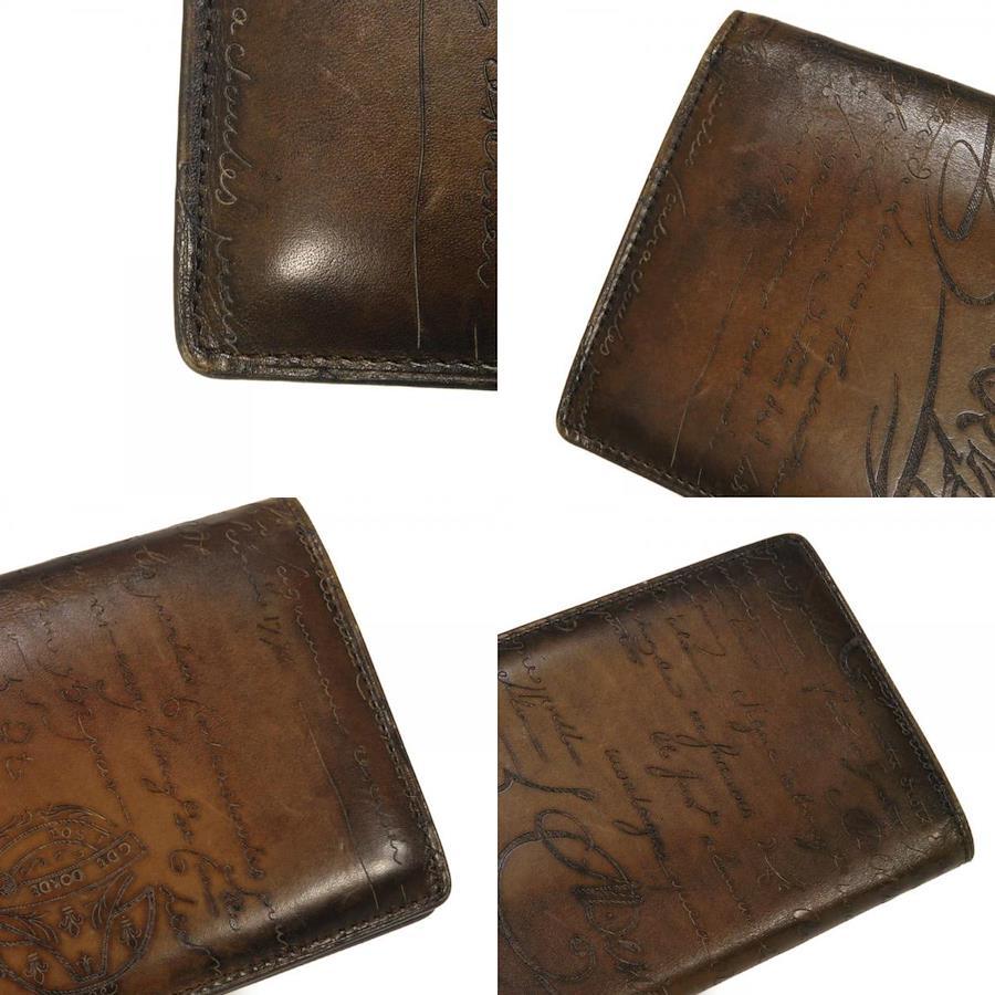 | ベルルッティのカリグラフィデザインとパティーヌの色付け技法で仕上げられた「エベネ スクリット フラップ ロングウォレット」二つ折り長財布です。 |