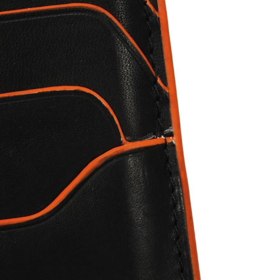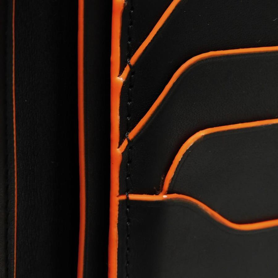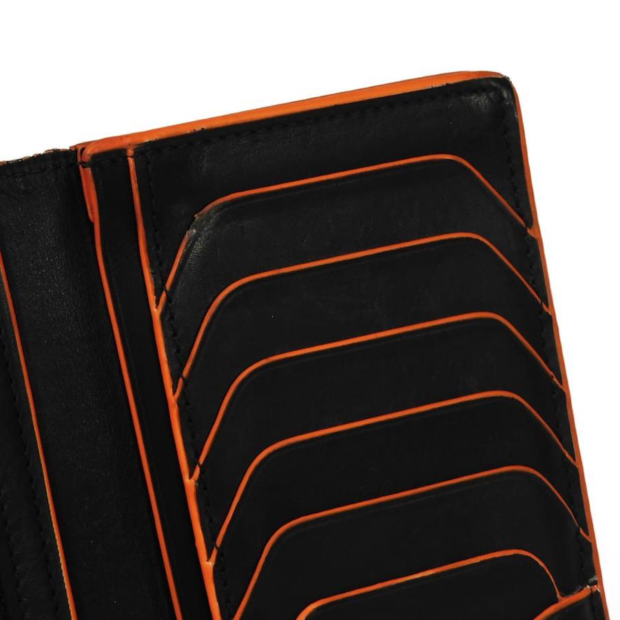 | ベルルッティのロゴがエンボス加工された、カリグラフィのデザインにライニングカラーとコーナーカラーを組み合わせた「サンタル スクリット フラップ ロングウォレット」二つ折り長財布です。 |