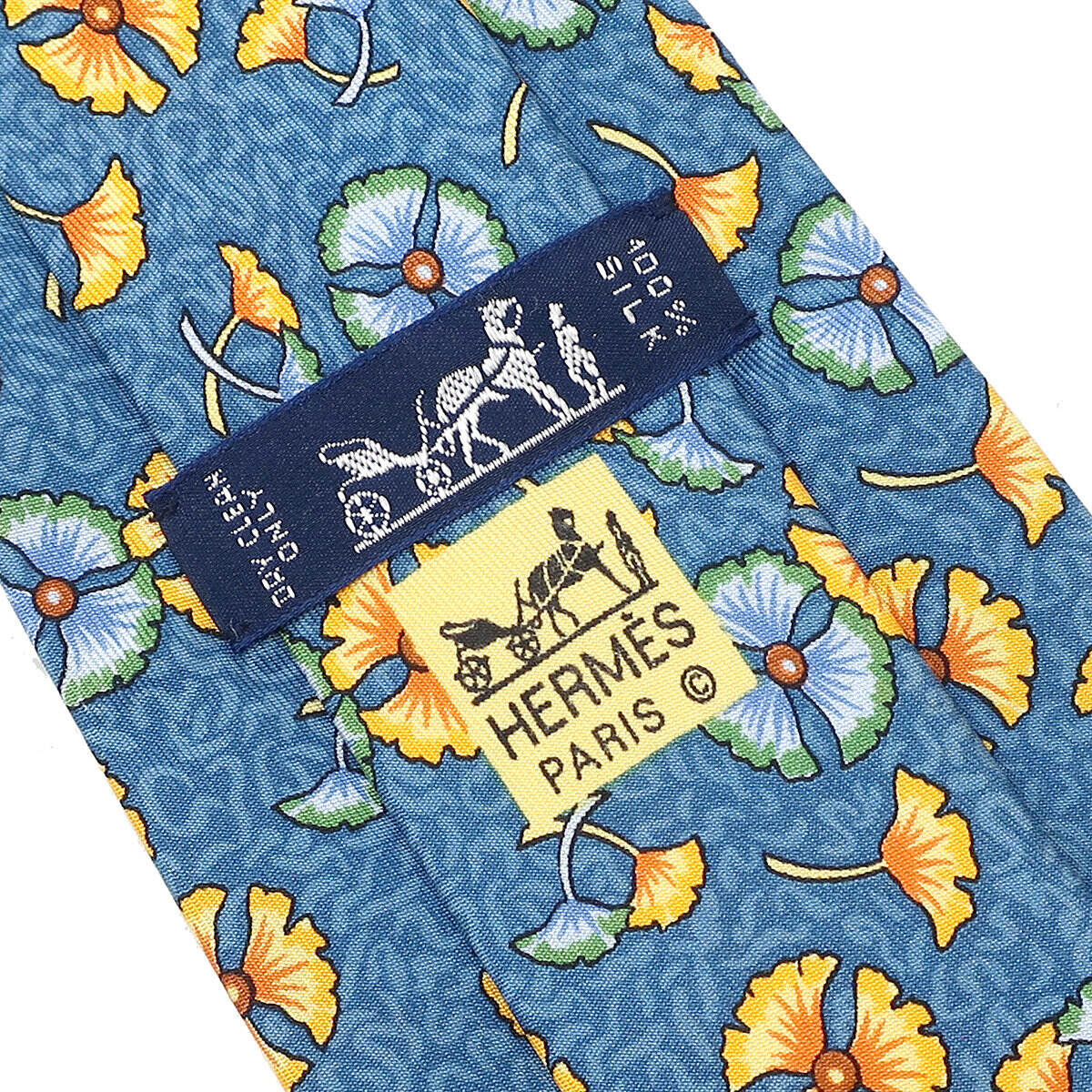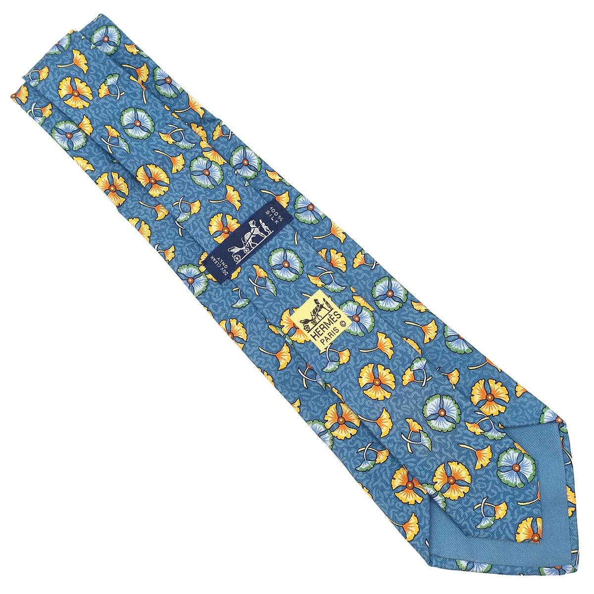 エルメス HERMES 植物柄 9cm ネクタイ シルク ブルー×マルチカラー 青 イチョウ 花 葉っぱ - メンズ定番 人気 美品 【中古】