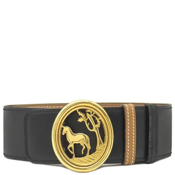エルメス HERMES ホースバックル ベルト ボックスカーフ ヴォーガリバー ブラック×ゴールド リバーシブル 黒 茶 ヴィンテージ ダブルホール ゴールド金具 ○J刻印 - レディース定番 人気 美品 【中古】