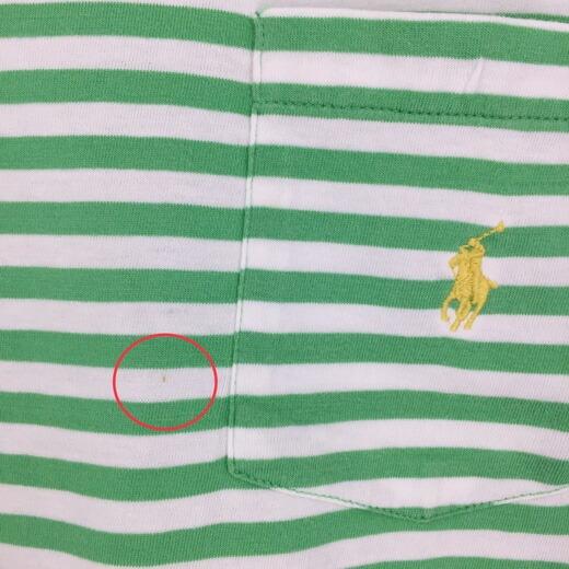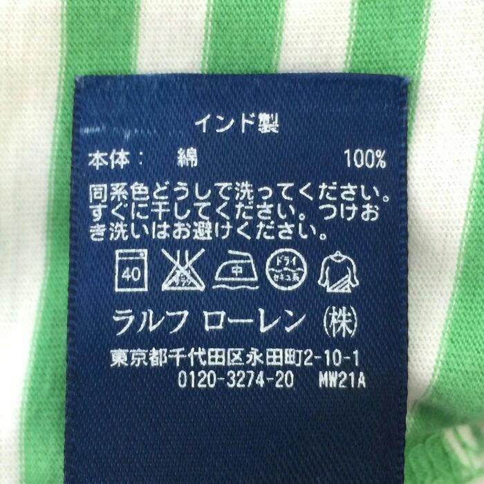 | 商品説明 | 【管理番号】 013431s09i 【ブランド名】 POLO RALPH LAURENポロ ラルフローレン 【アイテム】 半袖 Tシャツ 綿100% 男の子 【サイズ】 平置採寸(肩幅:約41.5cm・身幅:約44cm・袖丈:約20.5cm・着丈:約64.5cm) 【色・柄】 グリーン ホワイト ボーダー柄 【素材】 綿100% 【外観ランク】Aランク 【商品補足説明】 ブランドロゴのタグが切られているためサイズは不明です。胸ポケットの横に0.1cm程のシミがあります |