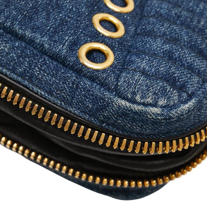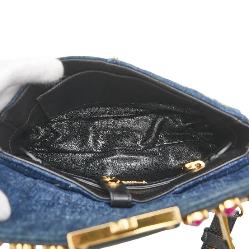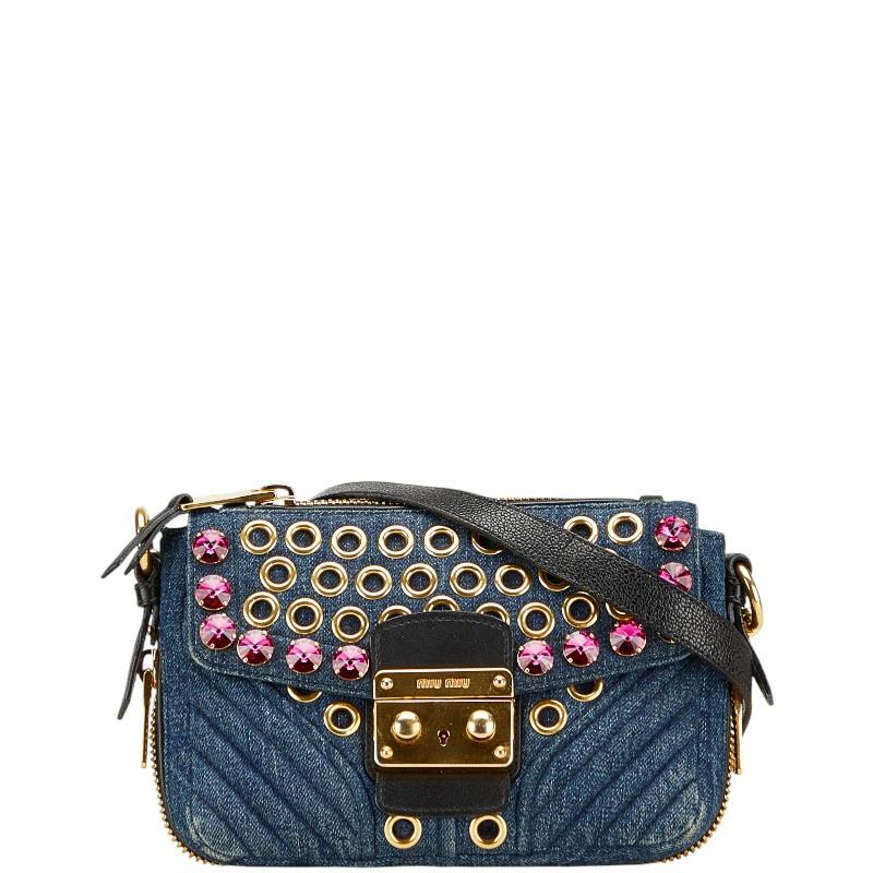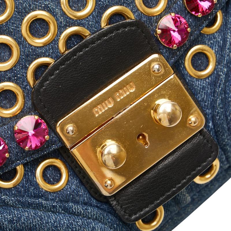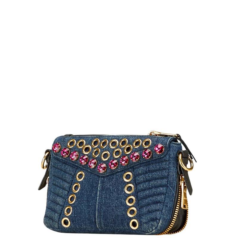 Pre-owned Miu Miu bejeweled crossbody shoulder bag in indigo blue and multicolored denim and leather.