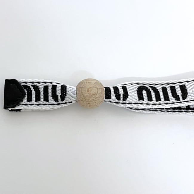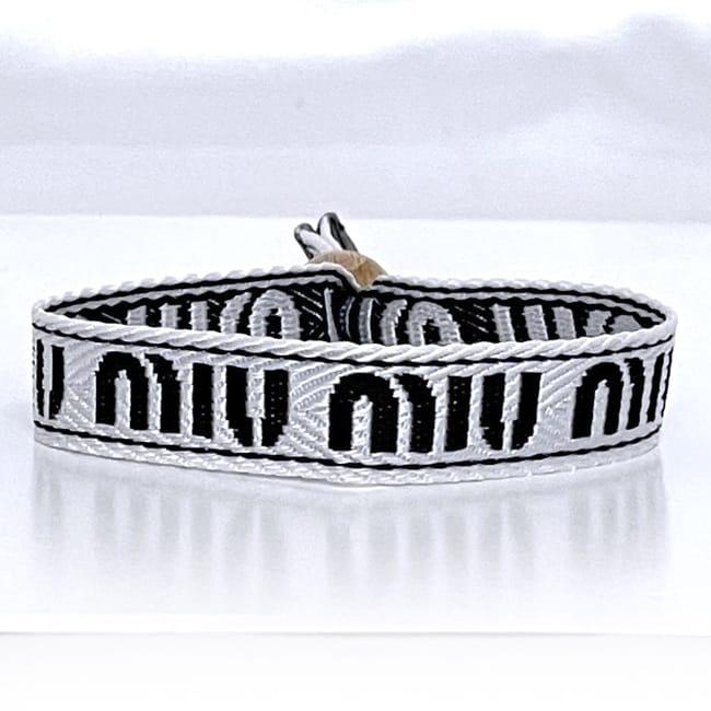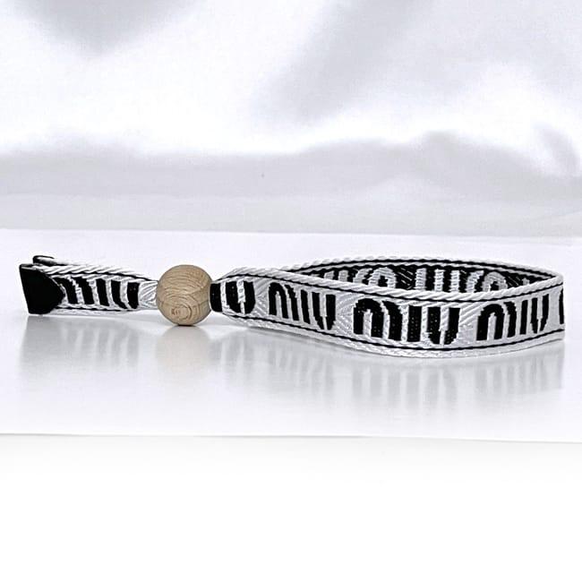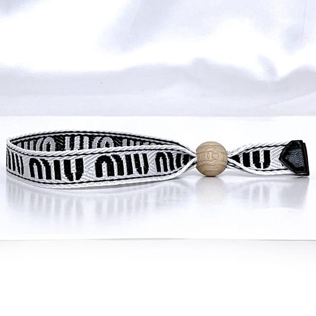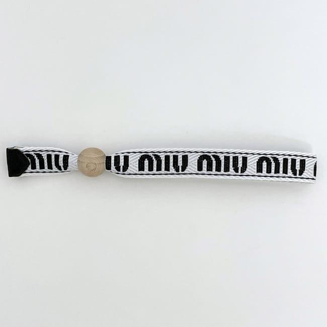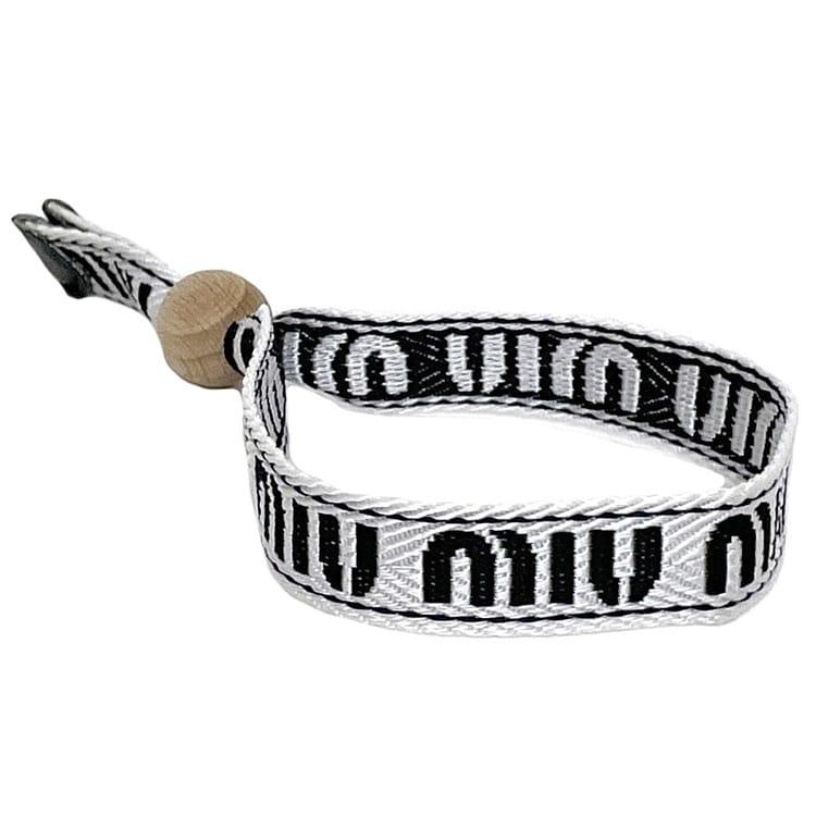 ミュウミュウ ブレスレット ec-23615 ホワイト ブラック 美品 ミサンガ キャンバス レザー ウッド 中古 miu miu ブレス ウッドビーズ 刺繍 フリーサイズ ロゴ 定番 人気 レディース メンズ カジュアル お洒落 シンプル 白色 白 黒 上品 ブランド 本物 鑑定済み