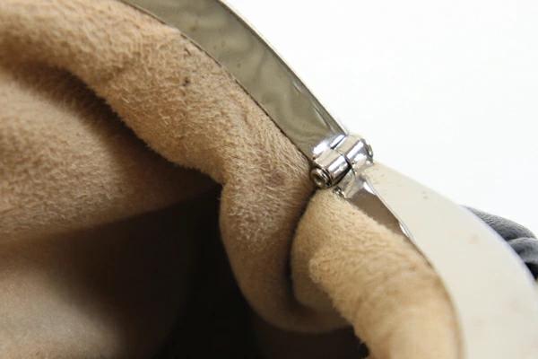 | 状態 | 外側:所々小キズ、薄スレあり。正面のモチーフにキズ、薄汚れあり。背面のステッチに薄変色あり 内側:スレ、薄汚れ、毛羽立ちあり。 金具:小キズ、薄スレ、ガマ口の金具に若干クスミあり。 |