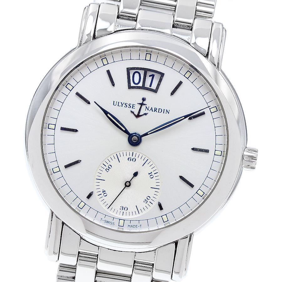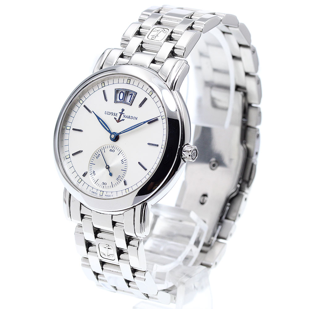 ■商品情報ブランド: ユリス・ナルダン/Ulysse Nardinモデル名: サンマルコ グランダット対象: メンズ素材: SS × SS文字盤色: シルバームーブメント:自動巻きRef.No: 343-22-BDシリアル:14***機能・特徴:デイト,スモールセコンド付属品:なし(本体のみ)ケースサイズ(w):約 37mmベルトサイズ:約 18cm※ベルトサイズとは、ケース部分も含めた総腕回りのサイズになります。ラグ幅: 19mm日差: +5秒/日 ※参考値OH歴: 弊社では実施しておりません。