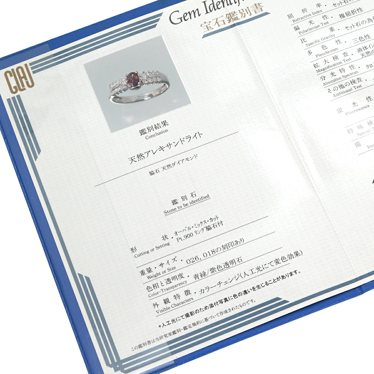 | 石目 | アレキサンドライト ダイヤモンド 0.26・0.18の刻印あり