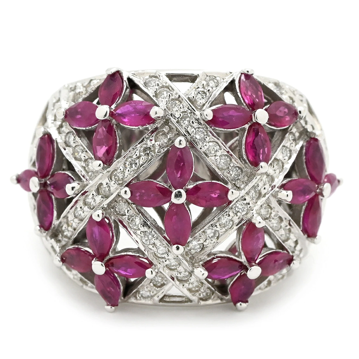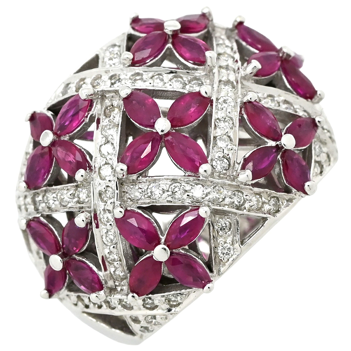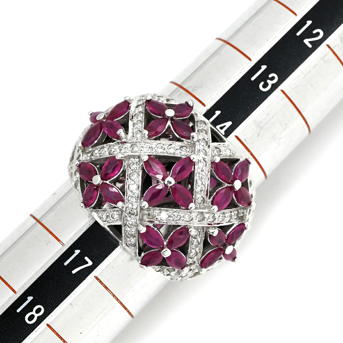 ▲クリックで拡大されますノンブランド NON BRAND リング 指輪 ラティス ダイヤリング K14WG ダイヤモンド ルビー ホワイトゴールド WG 14K ダイヤモンド ルビー フラワークラスター - 16号 レディース 【中古】