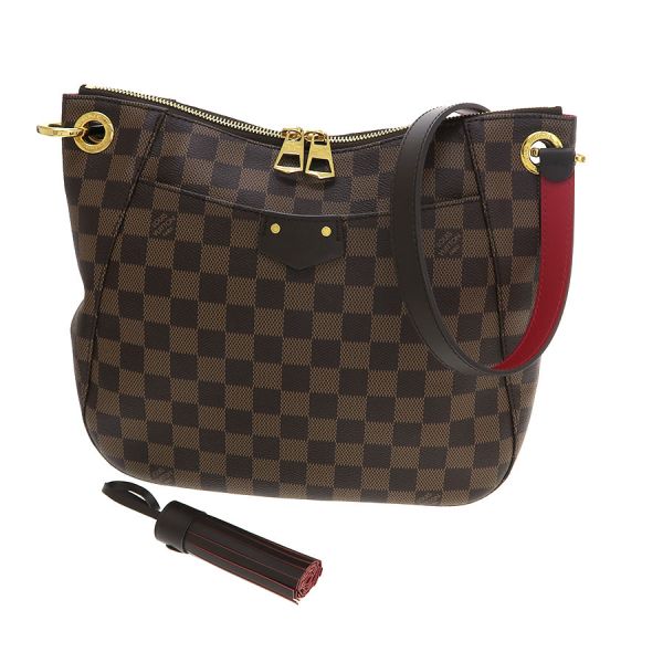 日常使いに最適!ヴィトン・ダミエのショルダーバッグ『サウス・バンク』が入いたしました。人気の高いダミエ柄で男女問わずお使い頂ける逸品。丸いフォルムが可愛らしく、タッセル付きの遊び心溢れる仕様。ゴールド金具が高級感溢れ、カジュアルにもキレイめにもマッチする優れものです。レザーの配色が茶×赤となり、よりモダンな雰囲気がプラスされ、スタイリッシュに持ち運び出来ますよ♪ 今回はAランクの入荷となり全体的な使用感及びダメージ等は比較的抑えられた状態となり、本体僅かな型崩れ、金具部の小傷、外ポケット間口レザー部の擦れ跡、僅かな角擦れ等を感じる状態となります。 既に廃盤となっているモデルとなり、キレイ目の状態での入荷が少なくなってきてておりオススメですよ!!