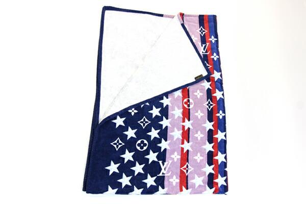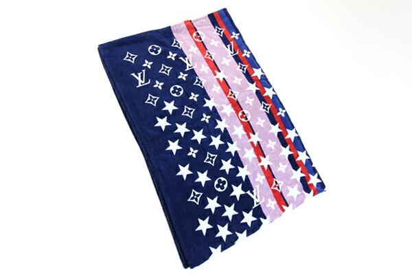 ルイヴィトンビーチタオルネイビーレッドコットン100%中古ブランケットバスタオル大判膝掛けインテリア星スターLOUISVUITTON