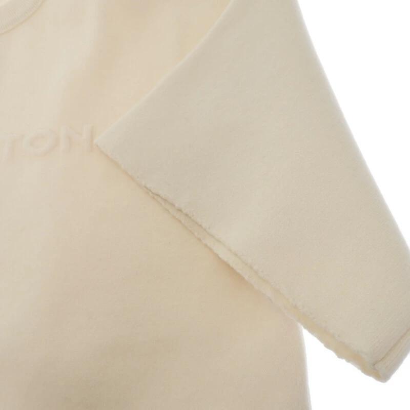 やや厚手でゆったりとしたドロップショルダーシルエットと、エンボス加工で施された胸元のブランドシグネチャーがモダンな印象です。