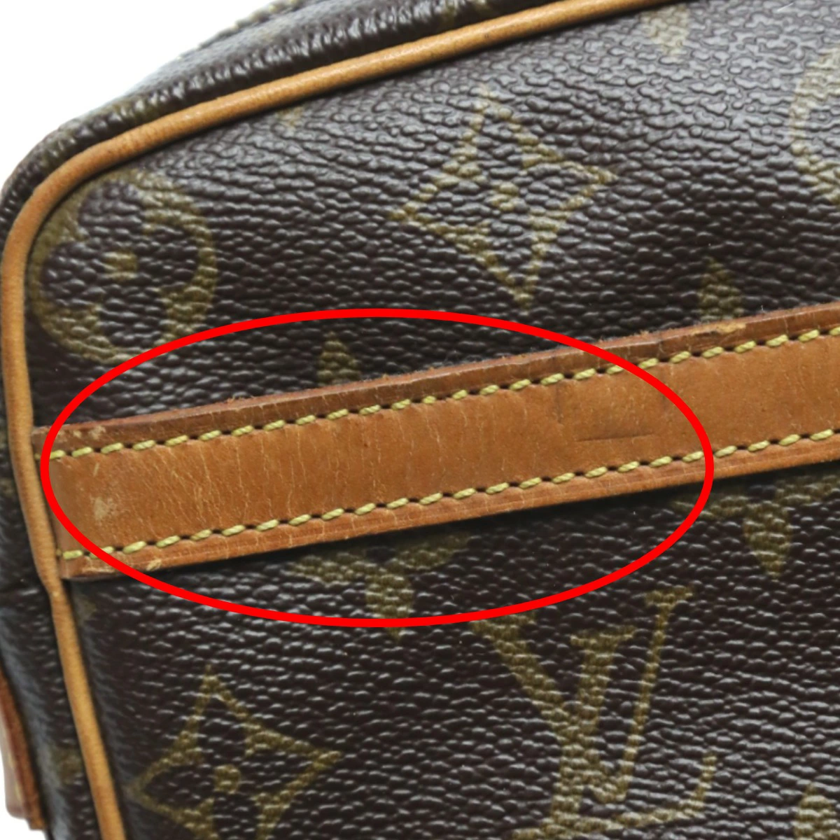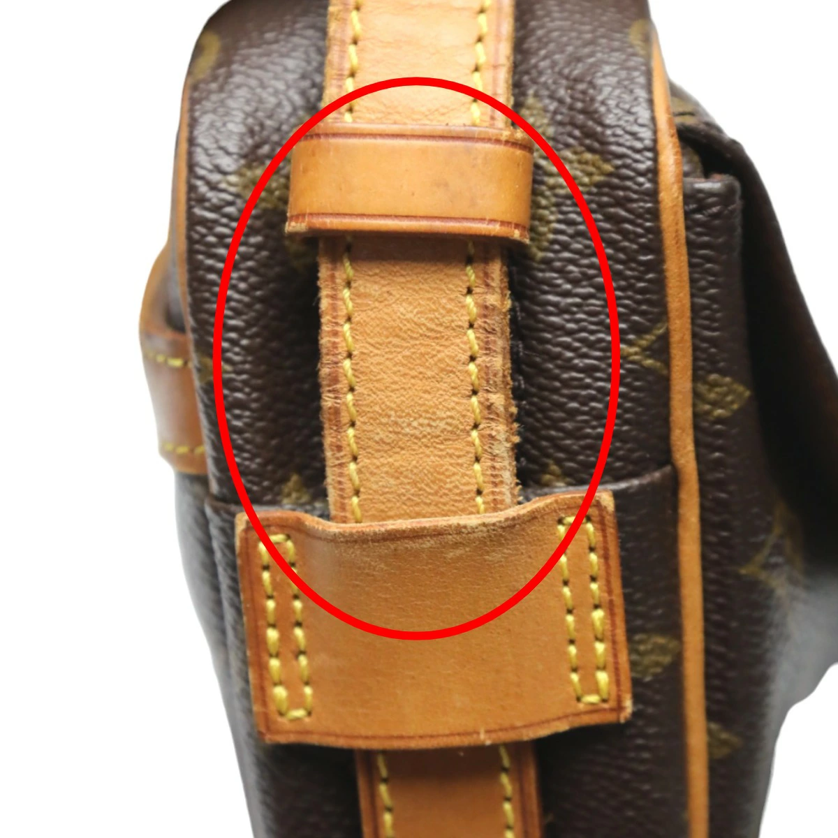 | 外側 | ランク:B 表面:薄汚れ、汚れ、スレ、シワ ハンドル・ストラップ:亀裂 コーナー:薄汚れ、スレ コーナー部分にスレや薄汚れがあります(画像6~9枚目参照) 表面や側面ベルト部分にシワや汚れ、スレがあります(画像10,12~13枚目参照) 開き口裏面に薄汚れがあります(画像14枚目参照) ショルダーストラップにスレや焼け、汚れ、亀裂あり(画像11.21枚目参照) |