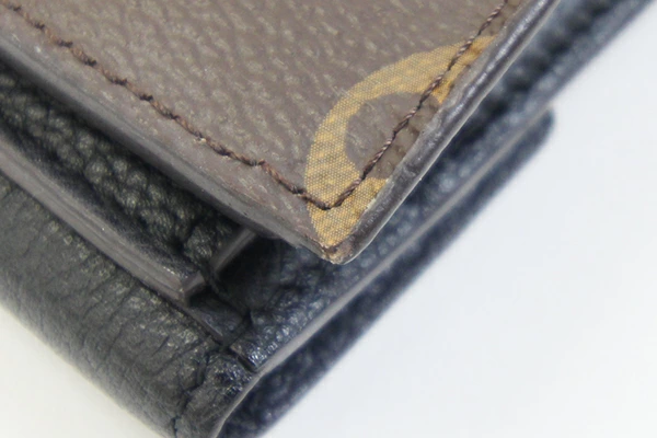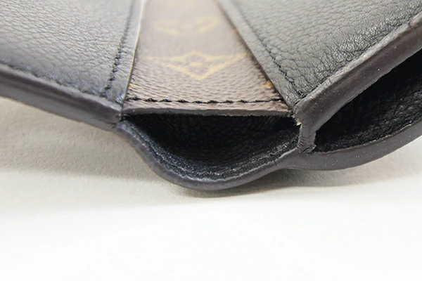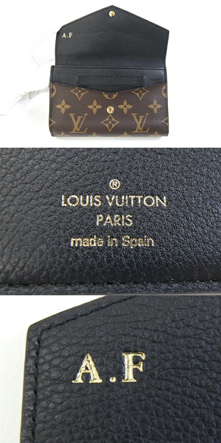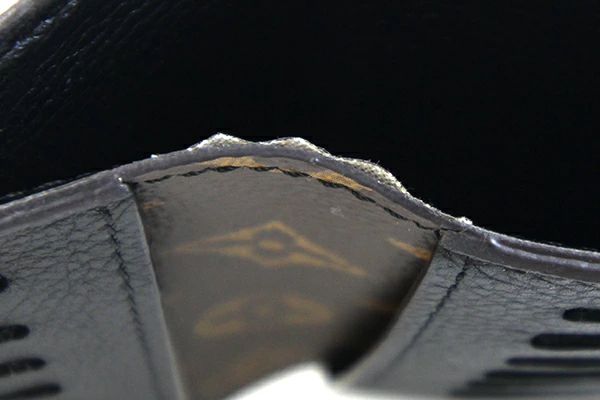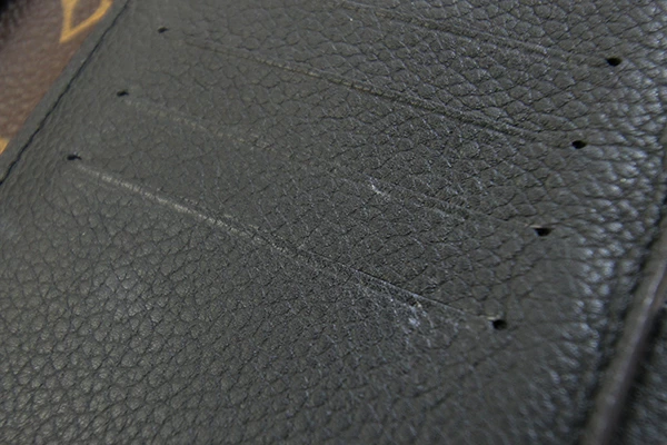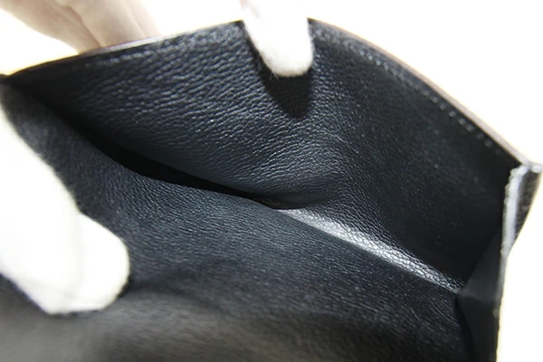 | 状態 | 外側:型崩れ、フチに反れあり。フチ周りに小キズ、薄スレ、コーティング割れあり。背面上部の角にスレあり。 内側:カード入れに使用跡、札入れのフチ、中央部分にコーティング剥がれあり。小銭入れに薄汚れあり。 金具:小キズ、スレあり。 ※「A.F」イニシャル刻印あり。 |