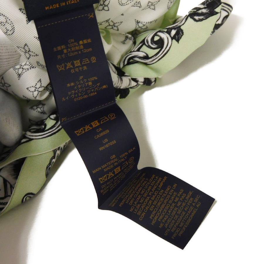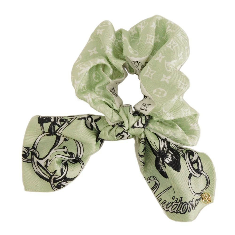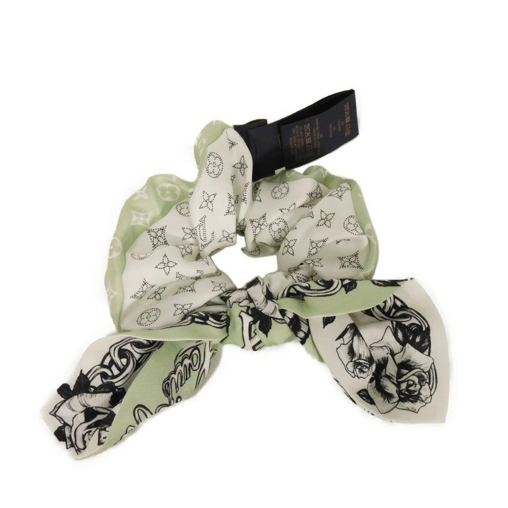 ルイヴィトンのモノグラムパターンのシルク素材にフラワー、バタフライ、パドロックなどがデザインされた「シュシュ・ブルーミング モノグラム」シュシュです。 |