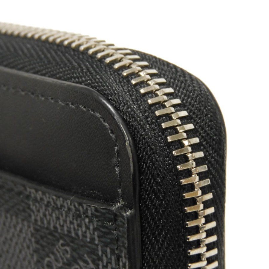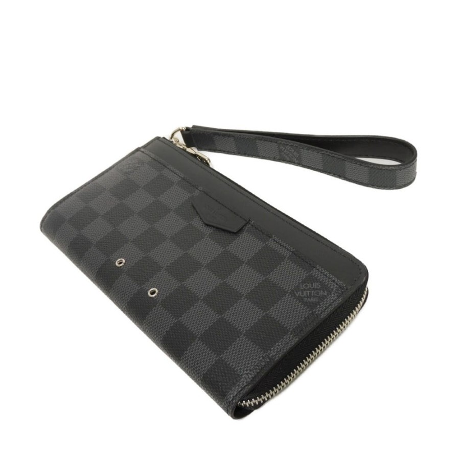 | ルイヴィトンのダミエグラフィットキャンバスにロゴパッチがあしらわれた「ジッピー・ドラゴンヌ」ハンドルストラップ付きラウンドファスナー型の長財布です。 |