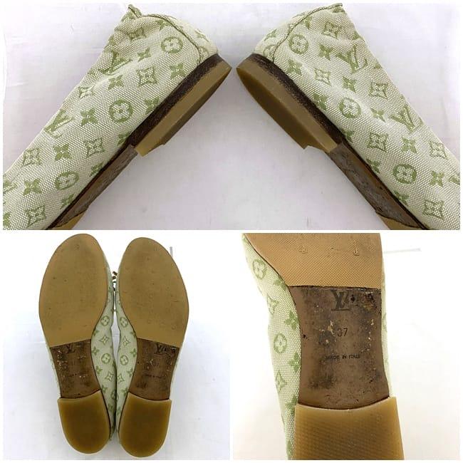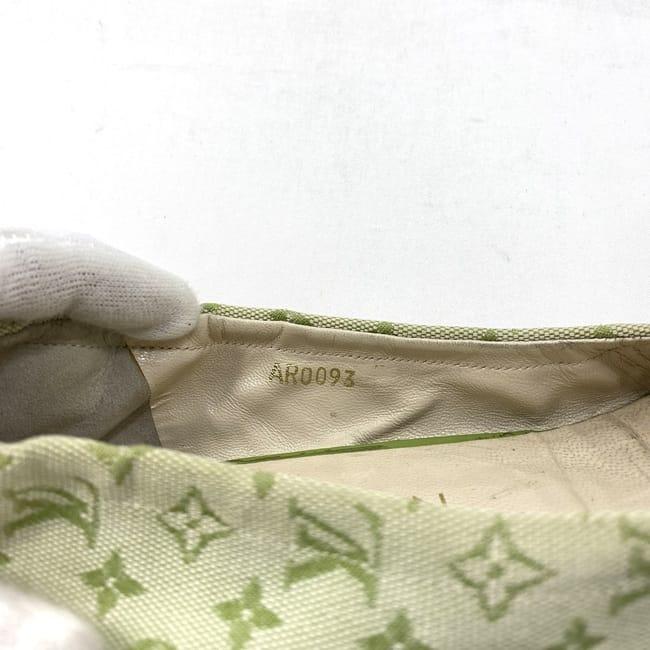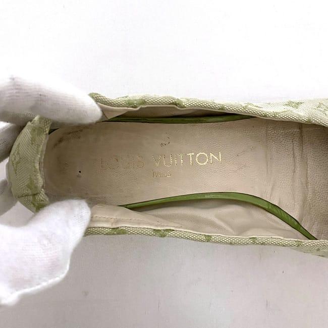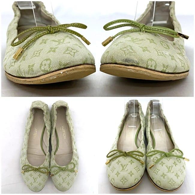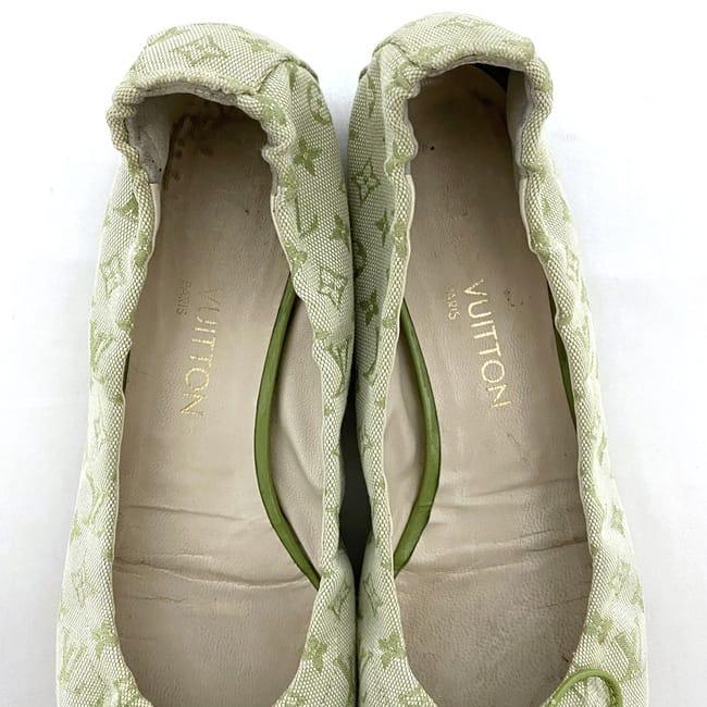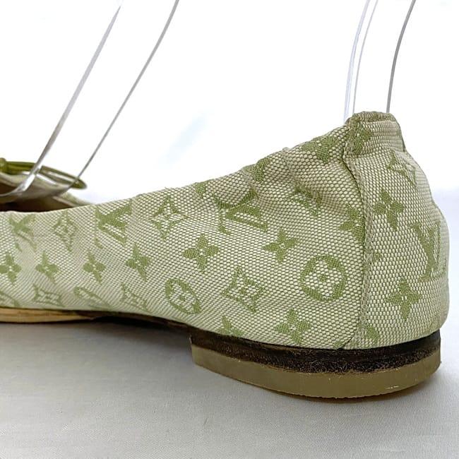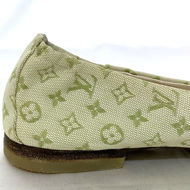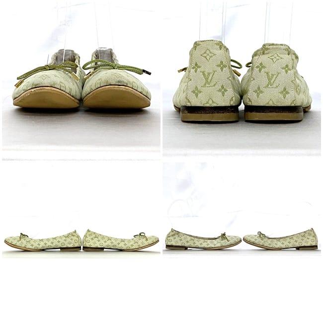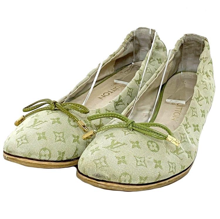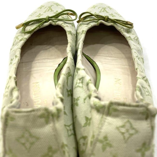 ルイ ヴィトン フラットシューズ ec-22814 ライトグリーン モノグラム ミニ 美品 24.0cm キャンバス ラバー 中古 AR0093 LOUIS VUITTON リボン 靴 バレエシューズ 総柄 ヴィンテージ レディース アパレル ロゴ お洒落 シューズ 高級感 ブランド 本物 鑑定済み