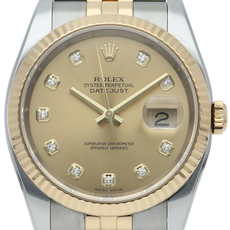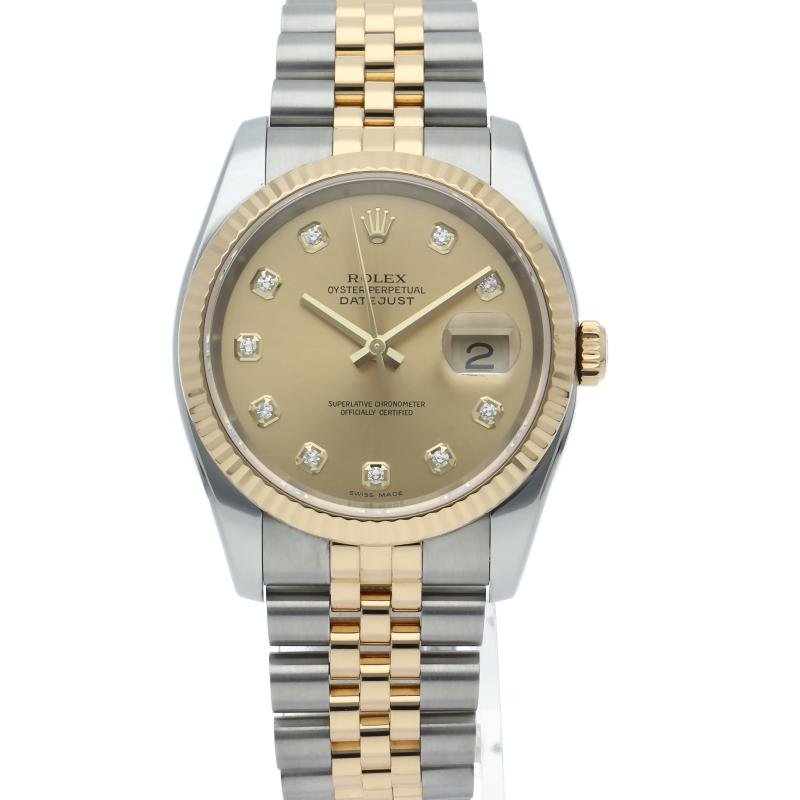 Rolex Datejust 36 Men's Watch with 10 Diamonds, 116233G(D), Box and Warranty, 18K Yellow Gold/SS, Champagne