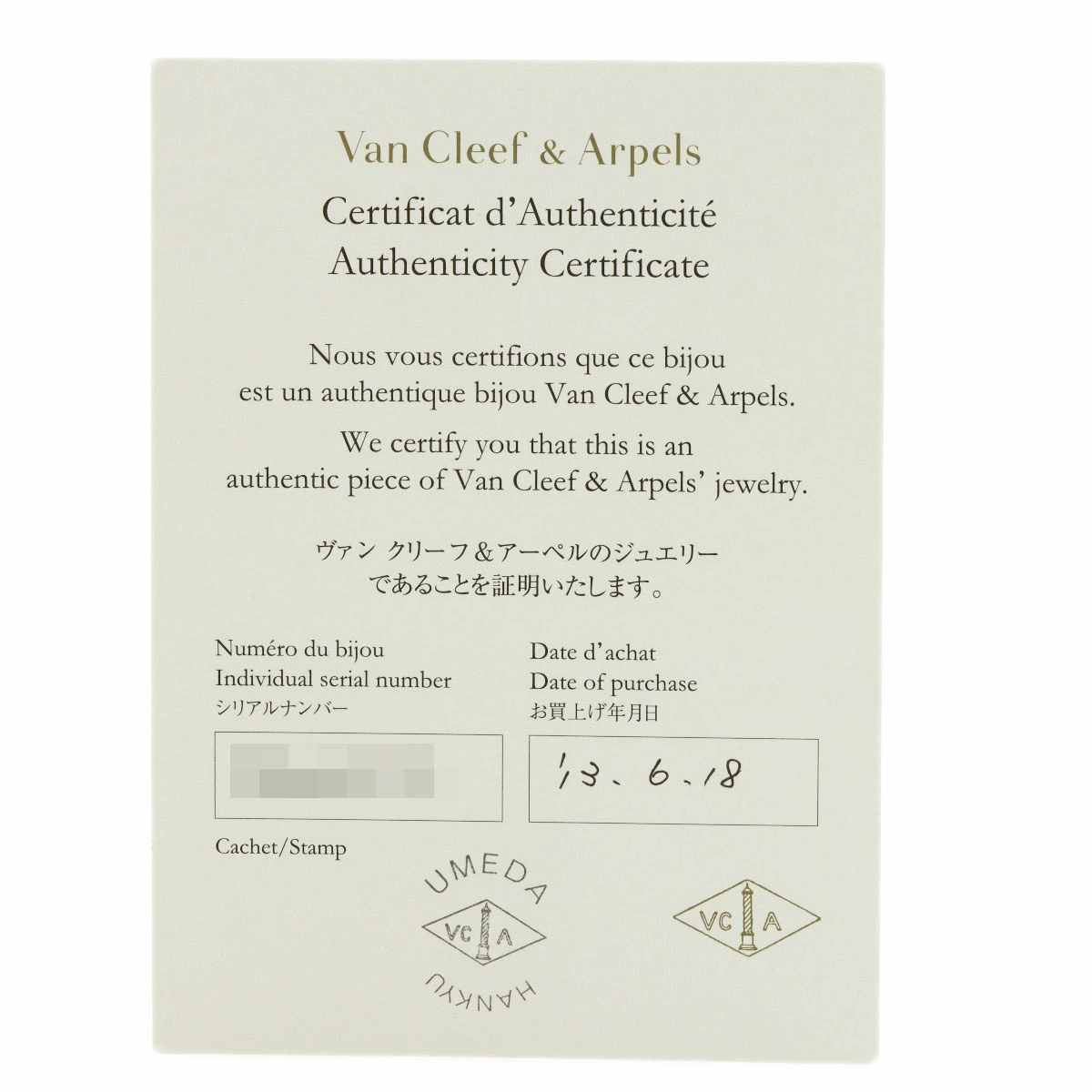 付属品ヴァンクリーフ保証書・箱・ケース