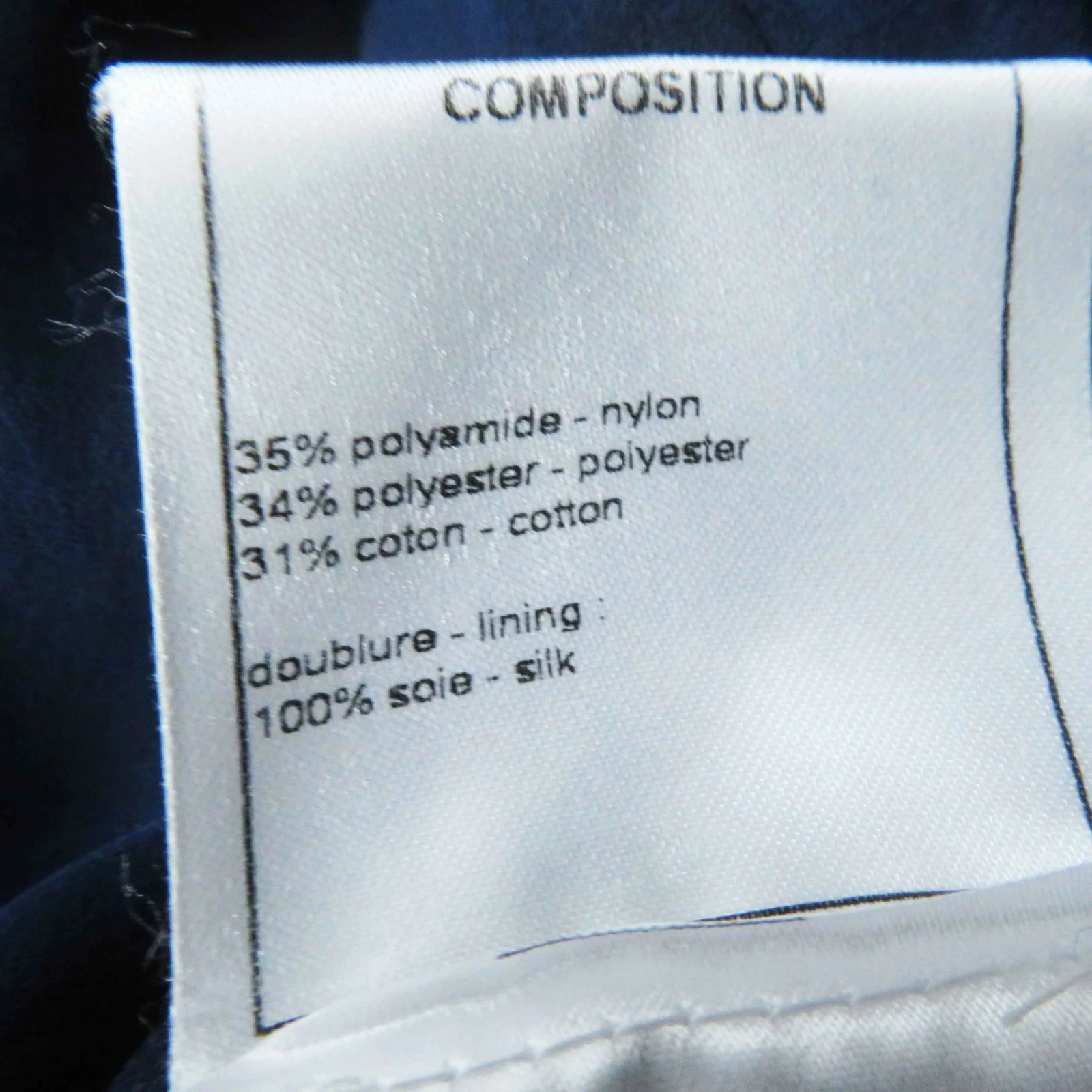 | 素材 (material) | 表地:ナイロン35% :ポリエステル34% :コットン31% 裏地:シルク100% | ||||||||||||||||