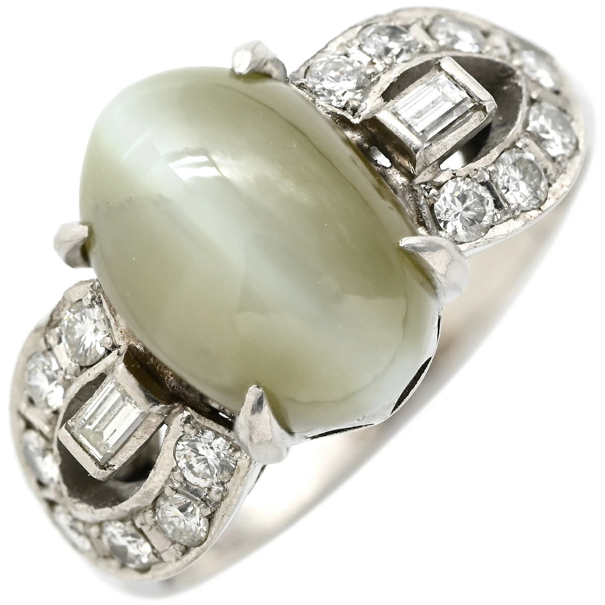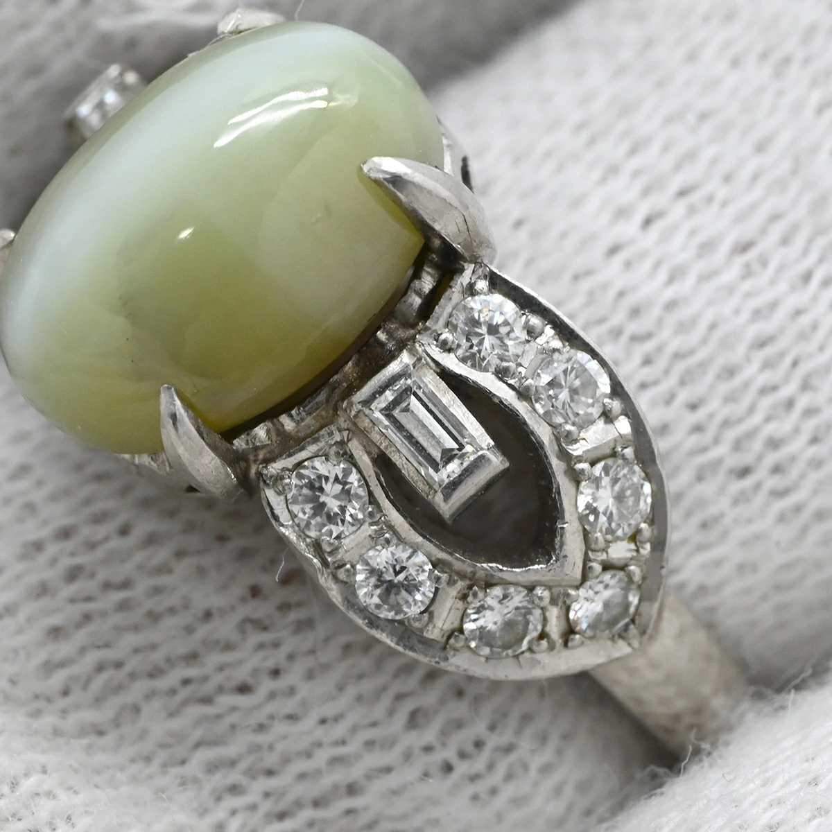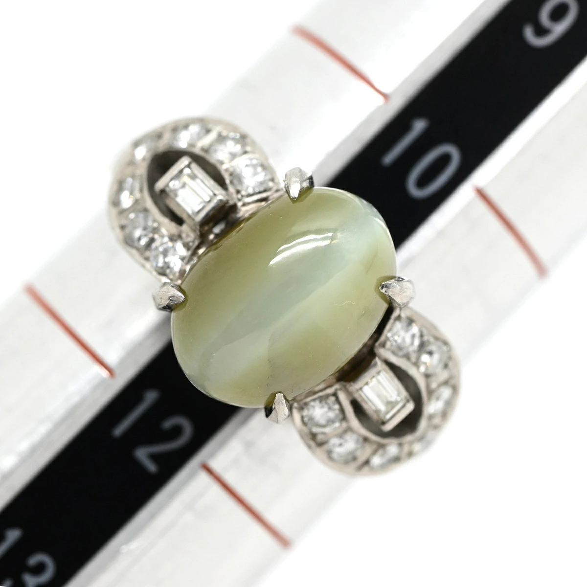 ▲クリックで拡大されますノンブランド NON BRAND リング 指輪 クリソベリルキャッツアイ ダイヤ Pt ダイヤモンド クリソベリルキャッツアイ オリーブグリーン×プラチナシルバー Pt プラチナム 緑 オリーブグリーン オーバル パヴェ バゲットカット 天然石 - 11号 レディース定番 人気 美品 【中古】